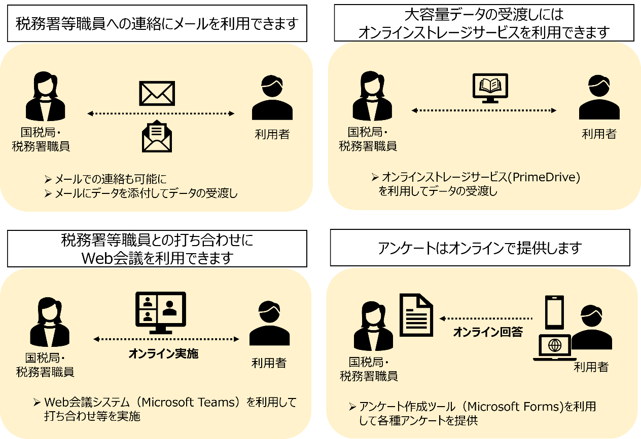 なお、本取組の実施については、国税当局の判断により必要に応じて行うため、オンラインツールの利用を希望された場合であっても、対面で税務調査等を実施させていただく場合があることにご留意ください。