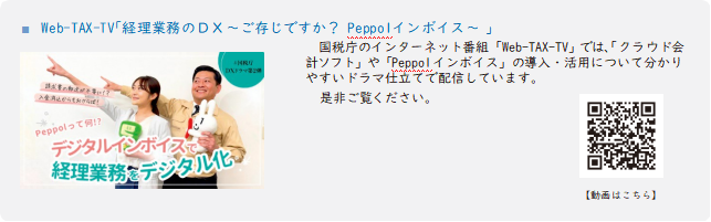 また、日々の業務がデジタル化されることにより、結果として税務手続のデジタル化につながることが期待されますので、国税庁では、クラウド会計ソフトやデジタルインボイス(Peppol1)の周知広報など、事業者の業務のデジタル化に向けた活動にも取り組んでいます。