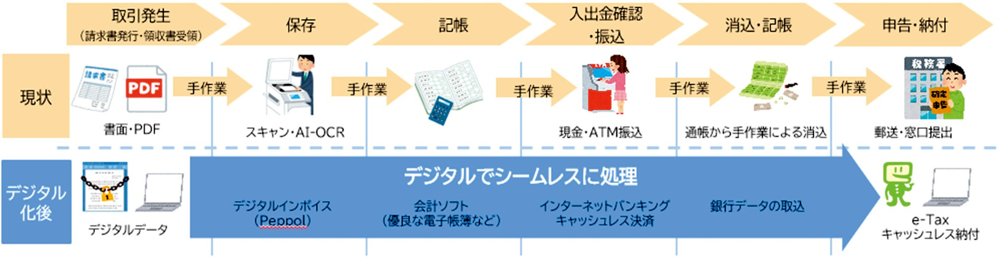 ※ 「デジタルシームレス」とは、人の手を介さないデジタルインボイス(Peppol)の活用等を通じて、請求や決済など取引段階の業務もデジタルで処理し、そのデータを記帳や税務申告にも活用するなど一貫してデジタル処理を行うことをいいます。
