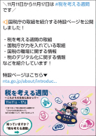特に、毎年11月11日から11月17日までの1 週間を「税を考える週間」とし、この期間を中心に様々な広報活動を行うとともに、税務行政に対するご意見やご要望をお寄せいただく機会としています。