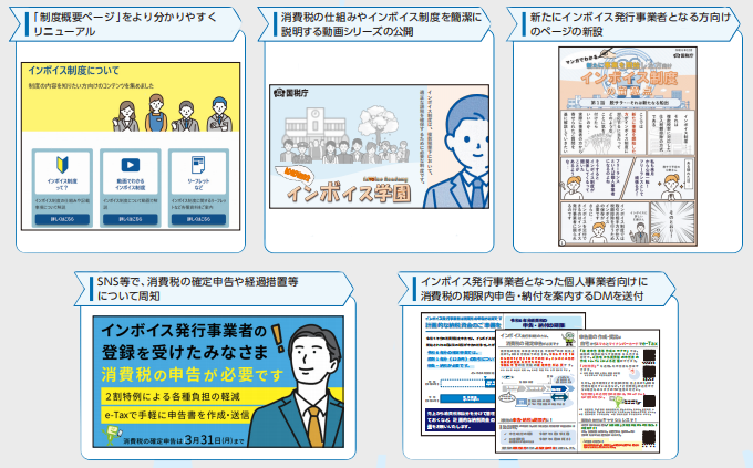 令和5(2023)年10月から開始したインボイス制度(適格請求書等保存方式)1については、事業者の方にインボイス制度を十分理解していただき、登録の要否の検討を含め、適切に制度への対応を進めていただくことが重要であることから、国税庁では、引き続き、事業者の方からの相談に丁寧に対応するなど、各種周知・広報等を実施しています。