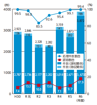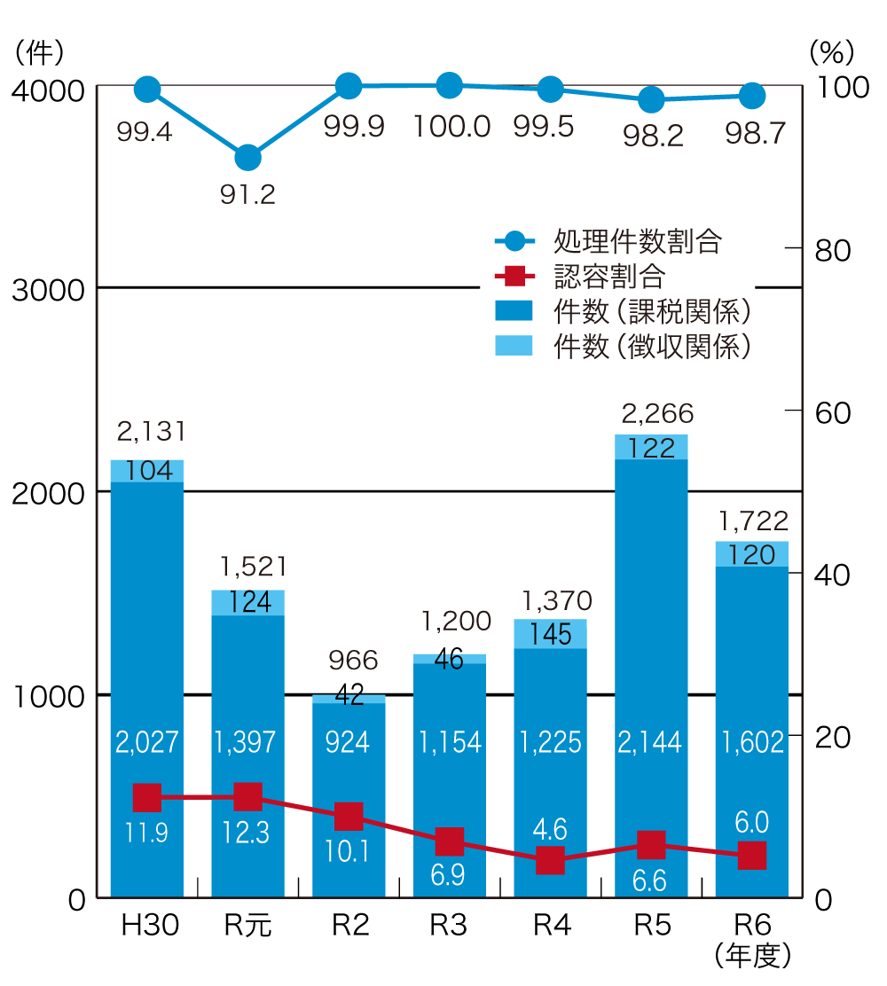 令和6(2024)年度における終結件数は168件(課税関係142件、徴収関係18件、審判所関係8件)であり、このうち納税者の請求の全部又は一部が認められた割合は4.8%です。