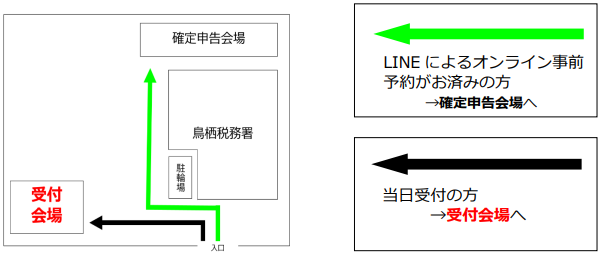 ・ LINE によるオンライン事前予約がお済みの方は、直接確定申告会場にお越しください。