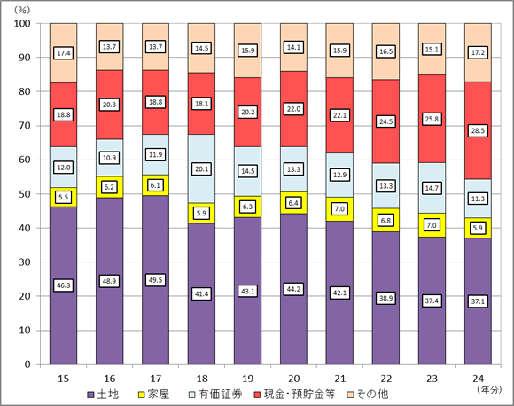 相続財産の金額の構成比は、土地37.1%(平成23年37.4%)、現金・預貯金等28.5%(平成23年25.8%)、有価証券11.3%(平成23年14.7%)の順となっています。