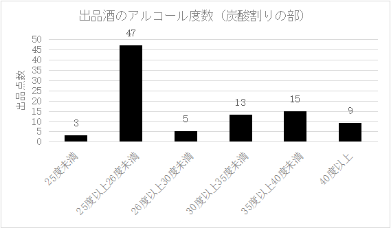 炭酸割り後のアルコール度数は5度以下から14度以上までと幅広く、8度台が最も多い結果となりました。これは25度の焼酎を1:2で割って8.3度にしたものが多かったことによります。また、優等賞のアルコール度数も幅広いですが、6度以上11度以下が大半でした。