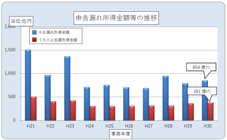 | 申告漏れ所得金額 | 4 | 億円 | 794 | 83.4% | 854 | 107.6% | |