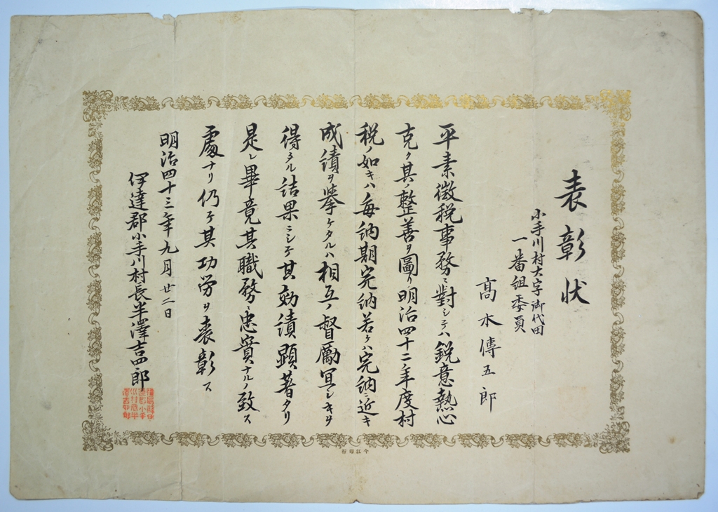 福島県伊達郡小手川村(現在の伊達市)の村長が、小手川村御代田一番組委員へ出したものです。村内をいくつかの組(納税組合)に分け、組合同士で納期限内の完納を競いました。納期限内で最も早く完納した組合には、賞金や賞品が贈呈されたりした地域もありました。