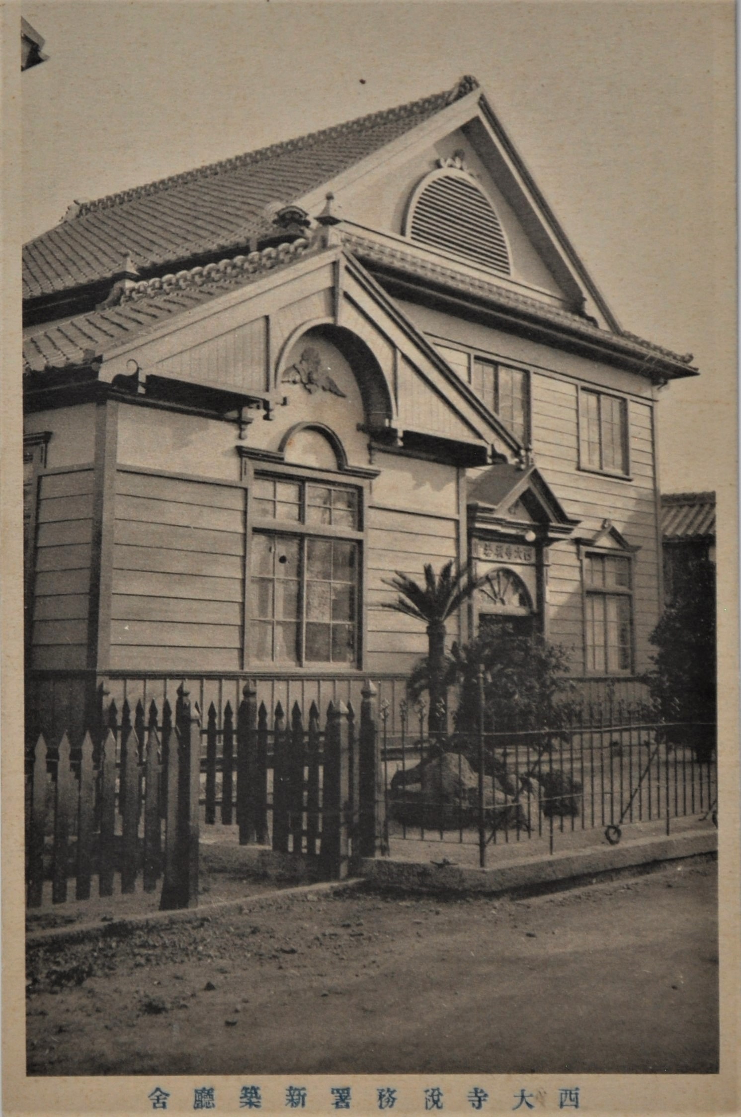 2枚とも、西大寺署の新築記念絵はがきです。下の絵はがきには、大正3(1914)年10月とあります。