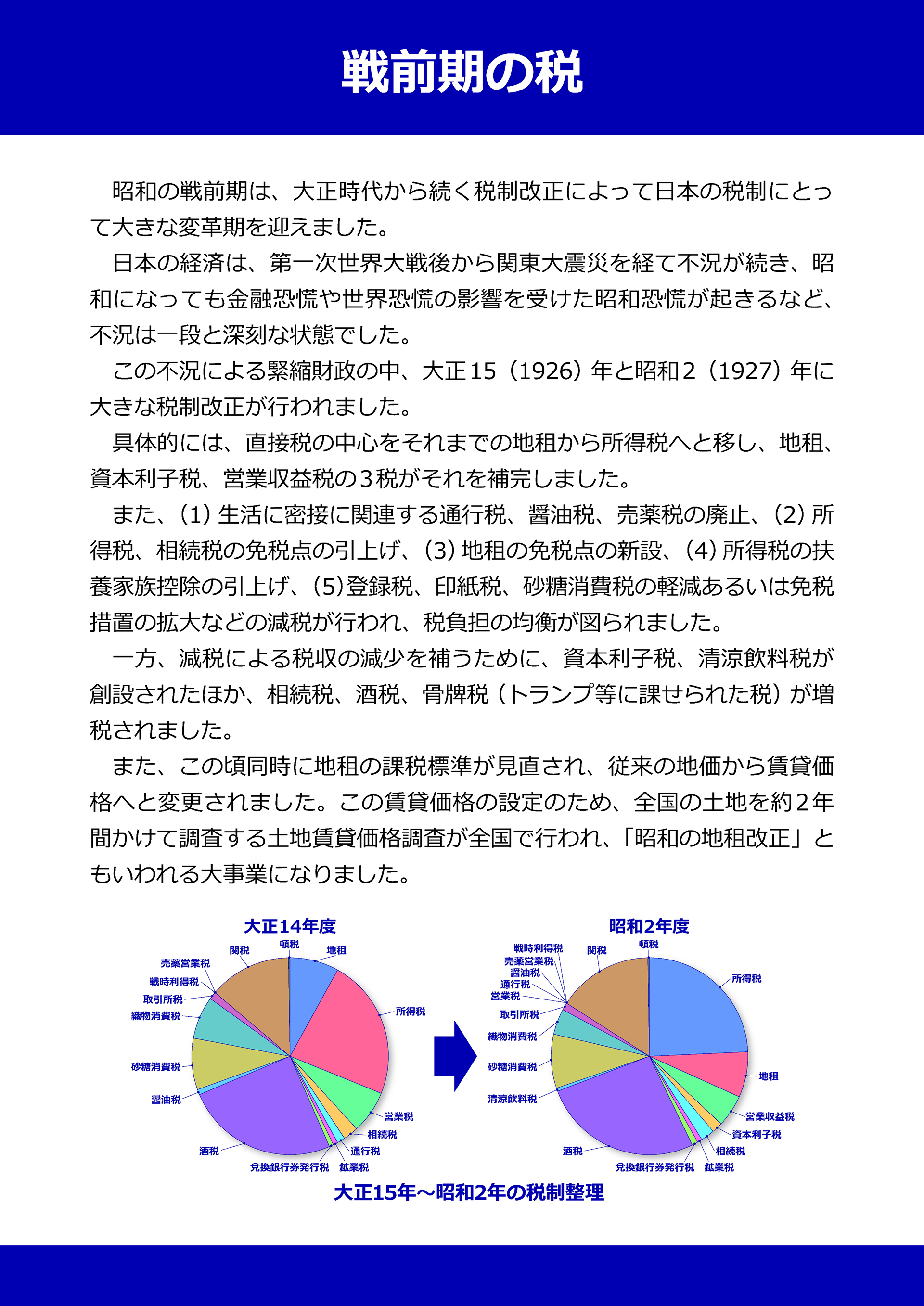 大正15(1926)年に行われた税制改正では、税の中心をそれまでの地租から所得税に移し、営業税や通行税など複数の税を廃止するなど、税制が大きく変わりました。