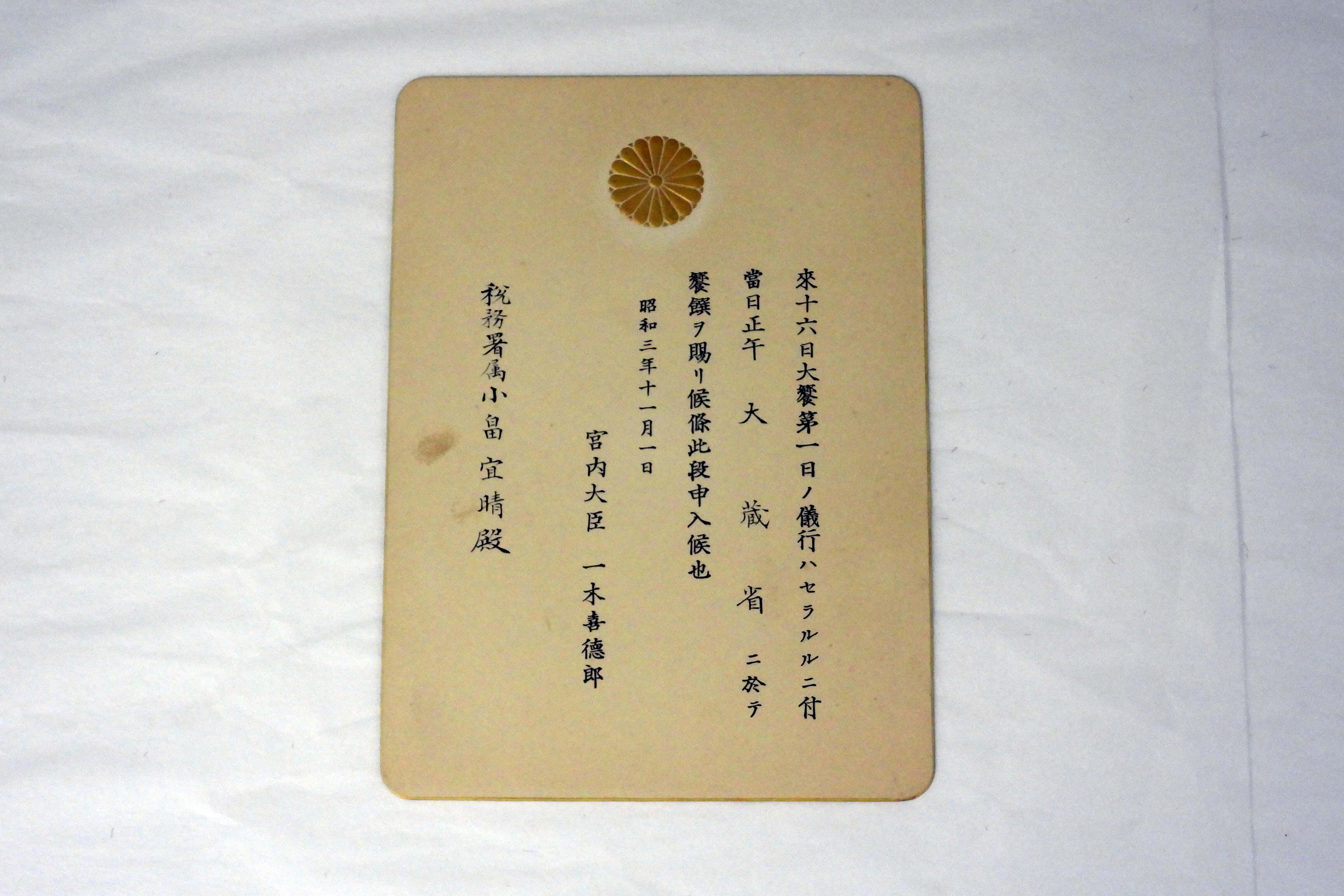 昭和天皇の即位(御大典)を祝う祝賀会の招待状です。昭和天皇の即位大礼式は昭和3(1928)年 11月10日に京都御所で行われました。即位に伴って全国各地で様々な奉祝行事が行われ、大蔵省や税務署でも祝賀会が開かれました。