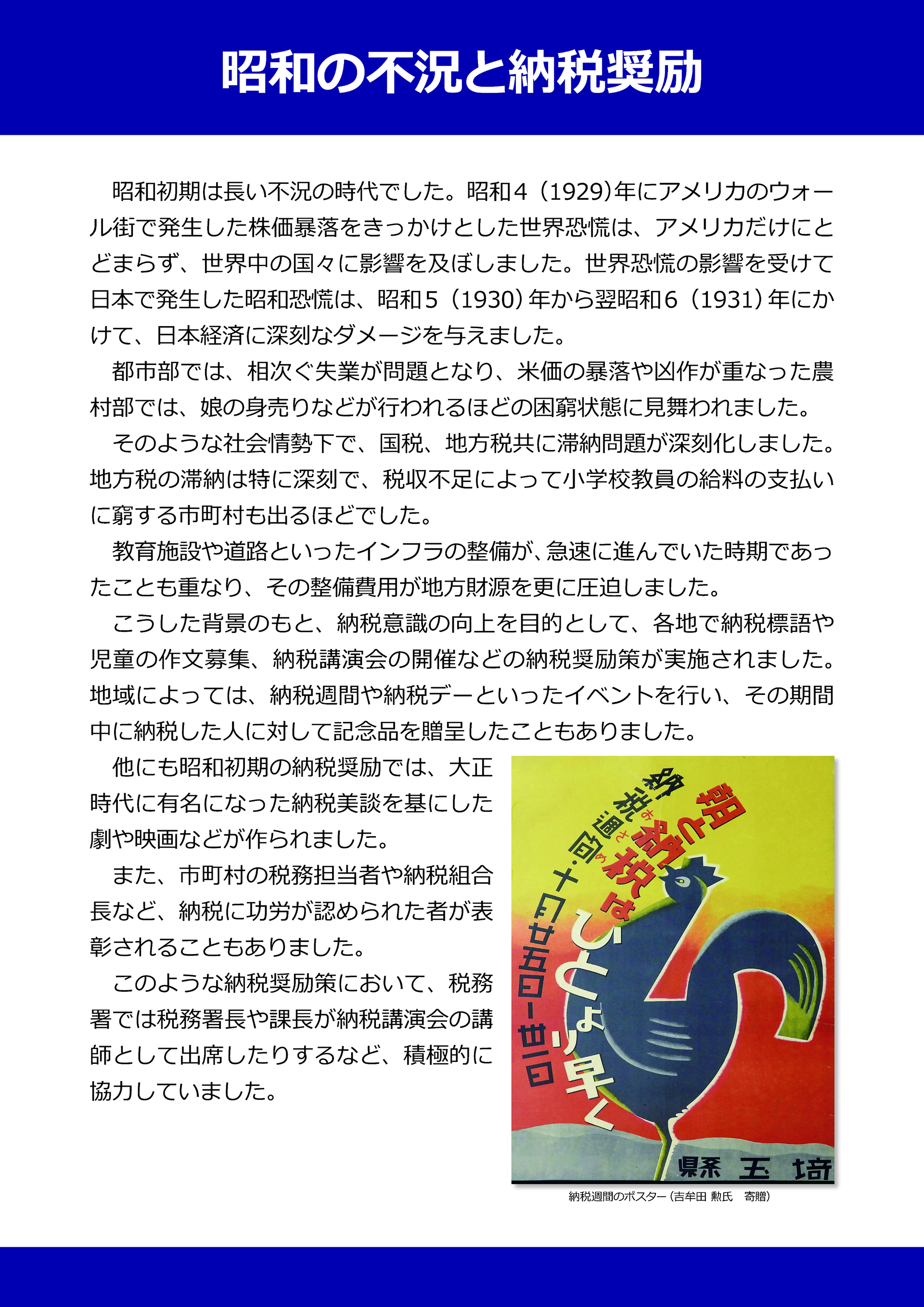 このような社会背景のもと税務署では、市町村や納税組合などと協力して納税奨励に力を入れ、納税美談の募集や納税週間の実施などを通して租税完納を呼びかけました。この納税奨励は税務署だけでなく、県や市町村も積極的に活動を行っていました。