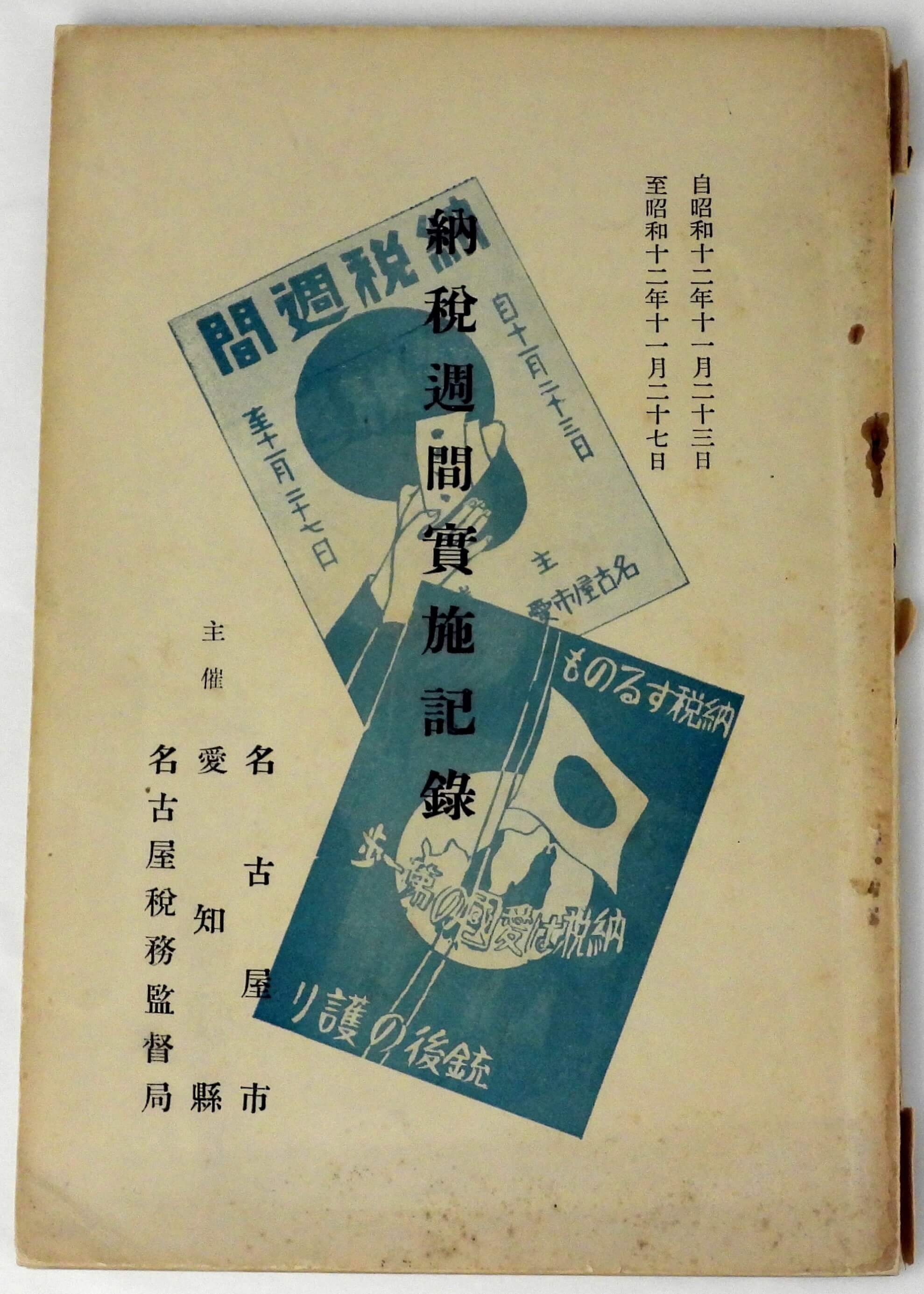 左の冊子は、昭和12(1937)年に名古屋で行われた納税週間に関する資料で、名古屋市、愛知県、名古屋税務監督局の3者が共催で実施したイベントの実施記録が記されています。