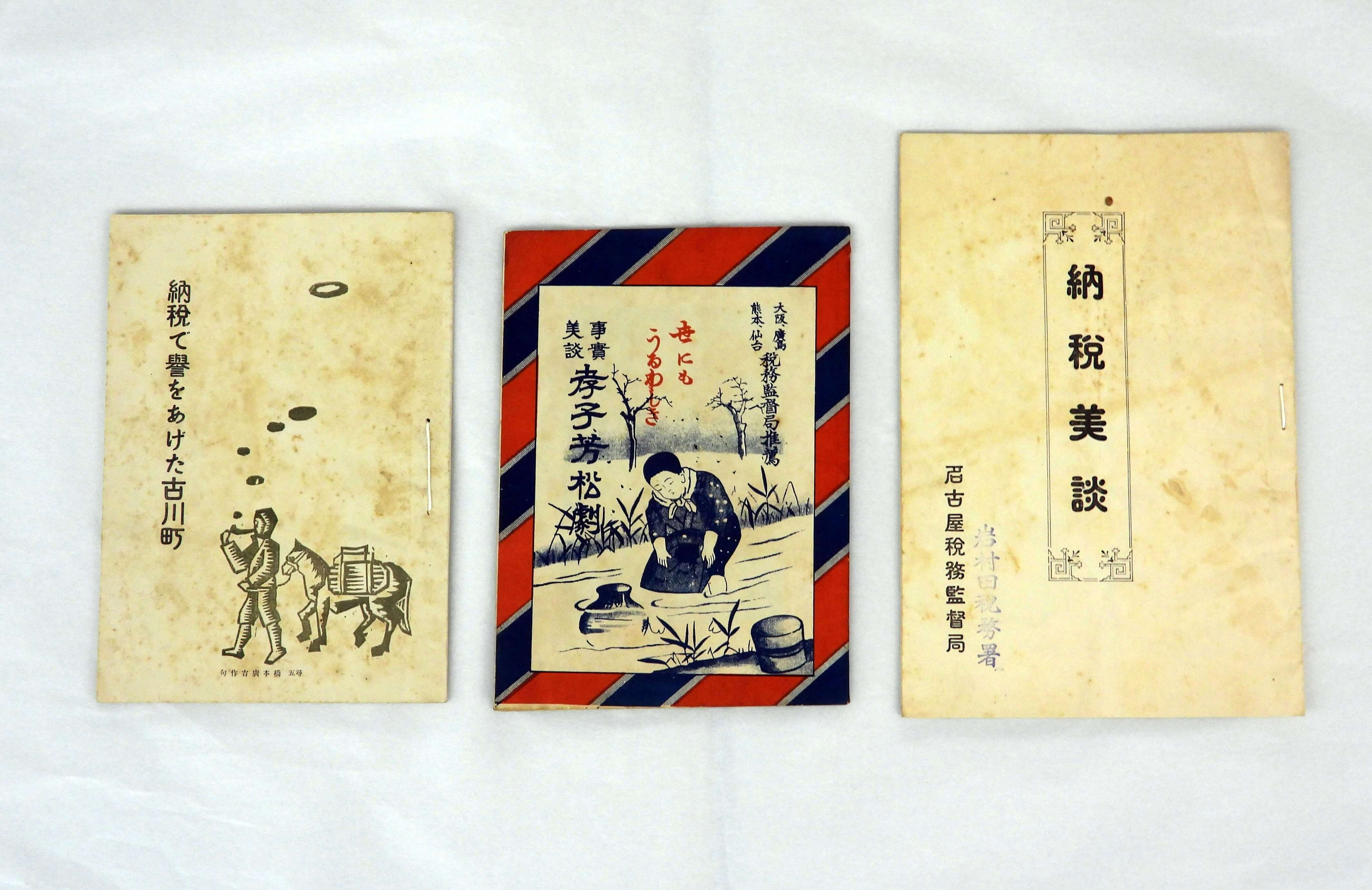 昭和の戦前期に発行された納税美談を紹介する冊子です。当局側が発行したものや個人が発行したものまで様々な形態がありますが、いずれも納税意識の向上を目的と作成されたものです。