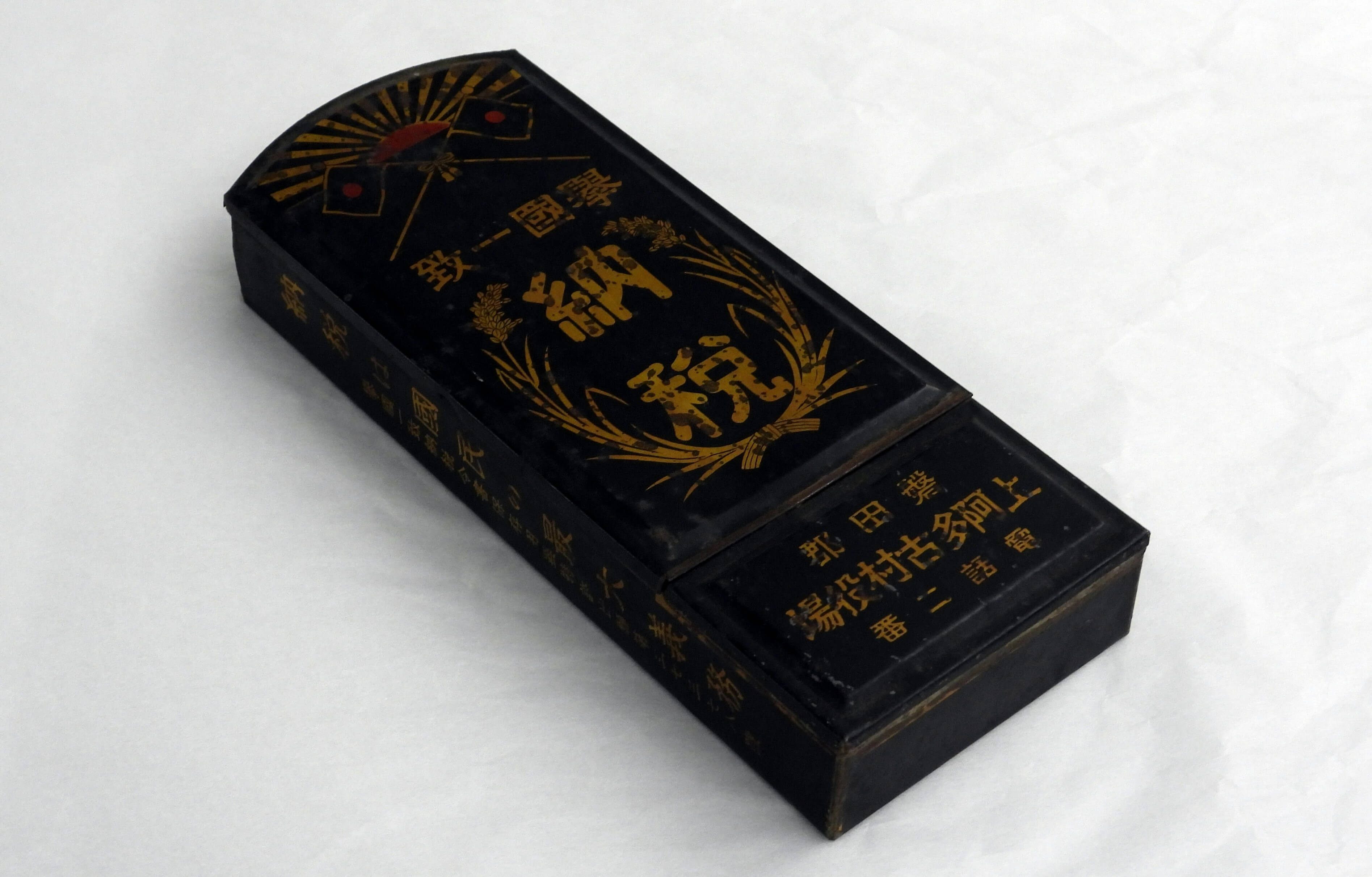 納税令書(徴税令書)や納税告知書などを入れるブリキ製の箱です。納税令書は、市町村が納税者に発行した納税に関する文書でした。戦前の市町村は市町村税だけでなく、府県税や一部の国税の徴収事務を行っていました。本史料は背面に穴が開いており、壁にかけて使用されたものであると想像されます。