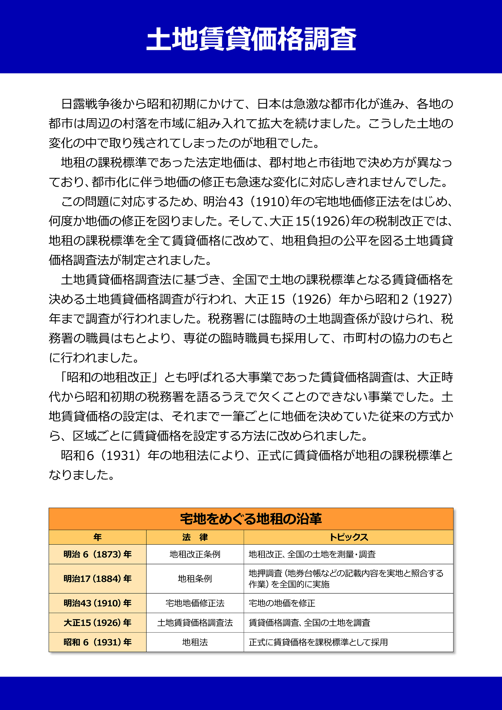 地租負担の公平を期すために、大正15(1926)年から昭和2(1927)年にかけて行われた土地賃貸価格調査は、明治以来続いてきた地租の課税標準を見直す大事業でした。
