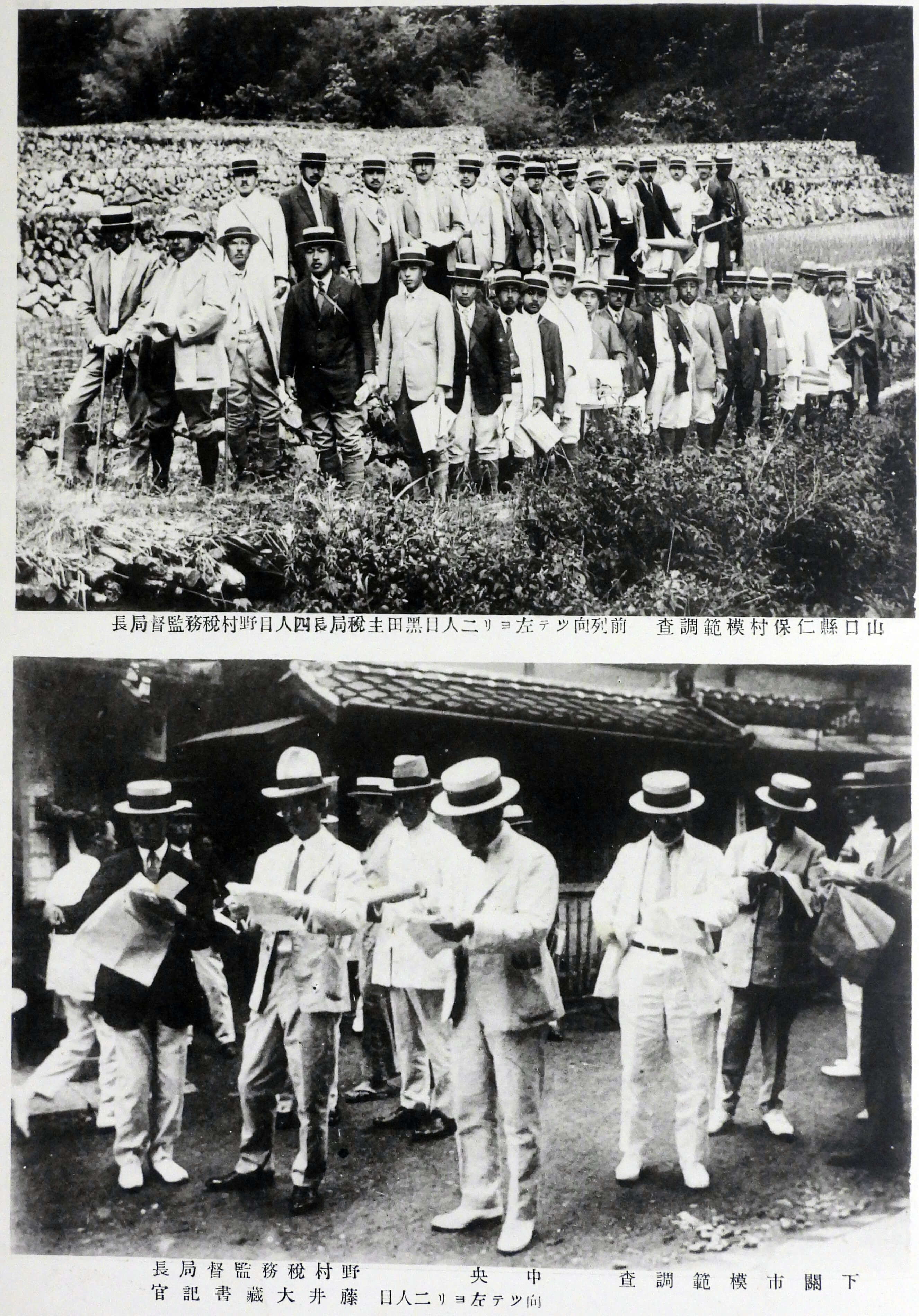 模範調査は、各局で調査を行う前に大蔵省の職員がやり方を指導することを目的として行われた調査でした。写真には、視察に来ていた主税局長や広島税務監督局長らの姿があります。