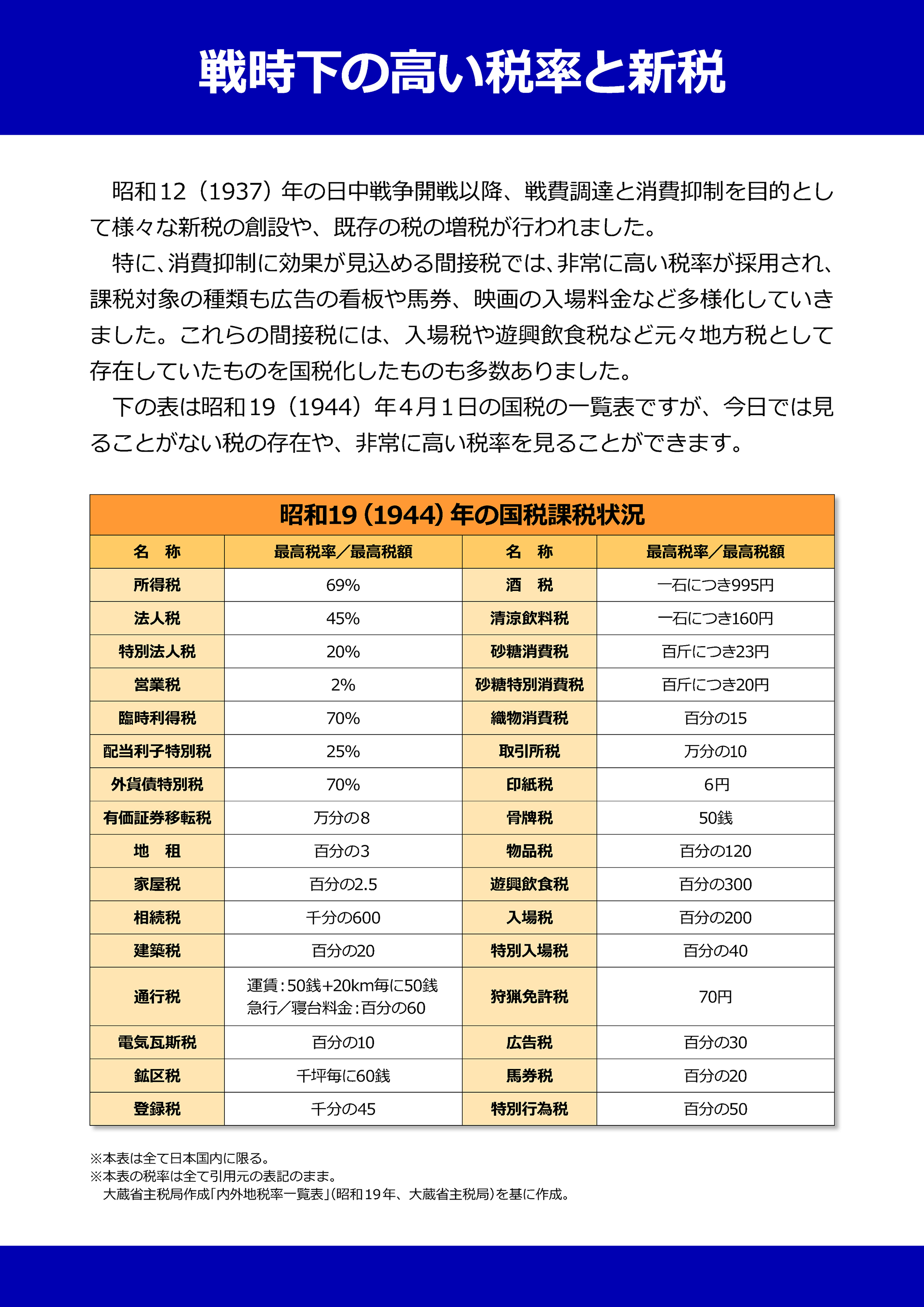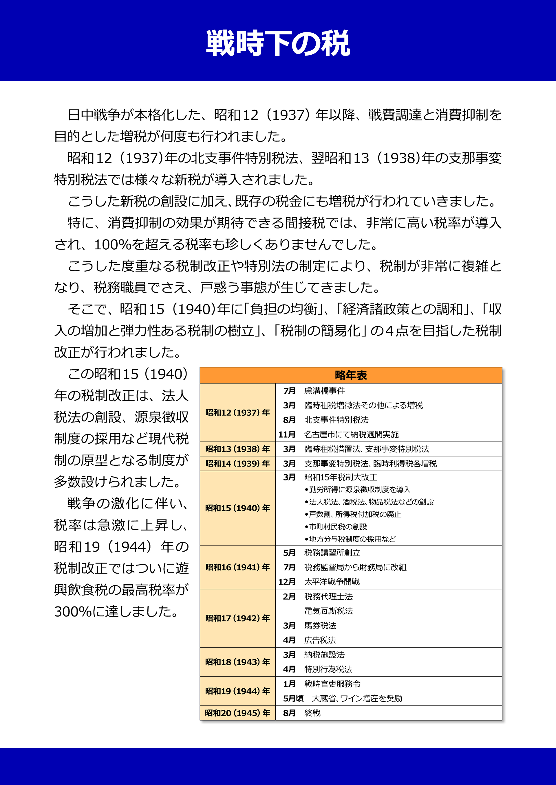 その後、日米開戦を受けて軍事費を中心に、戦時財政は飛躍的に肥大化し、その基礎を固めるために幾度も増税が行われました。この膨大な税額をいかにして徴収するのかが、この時期の税務行政上最大の問題となりました。