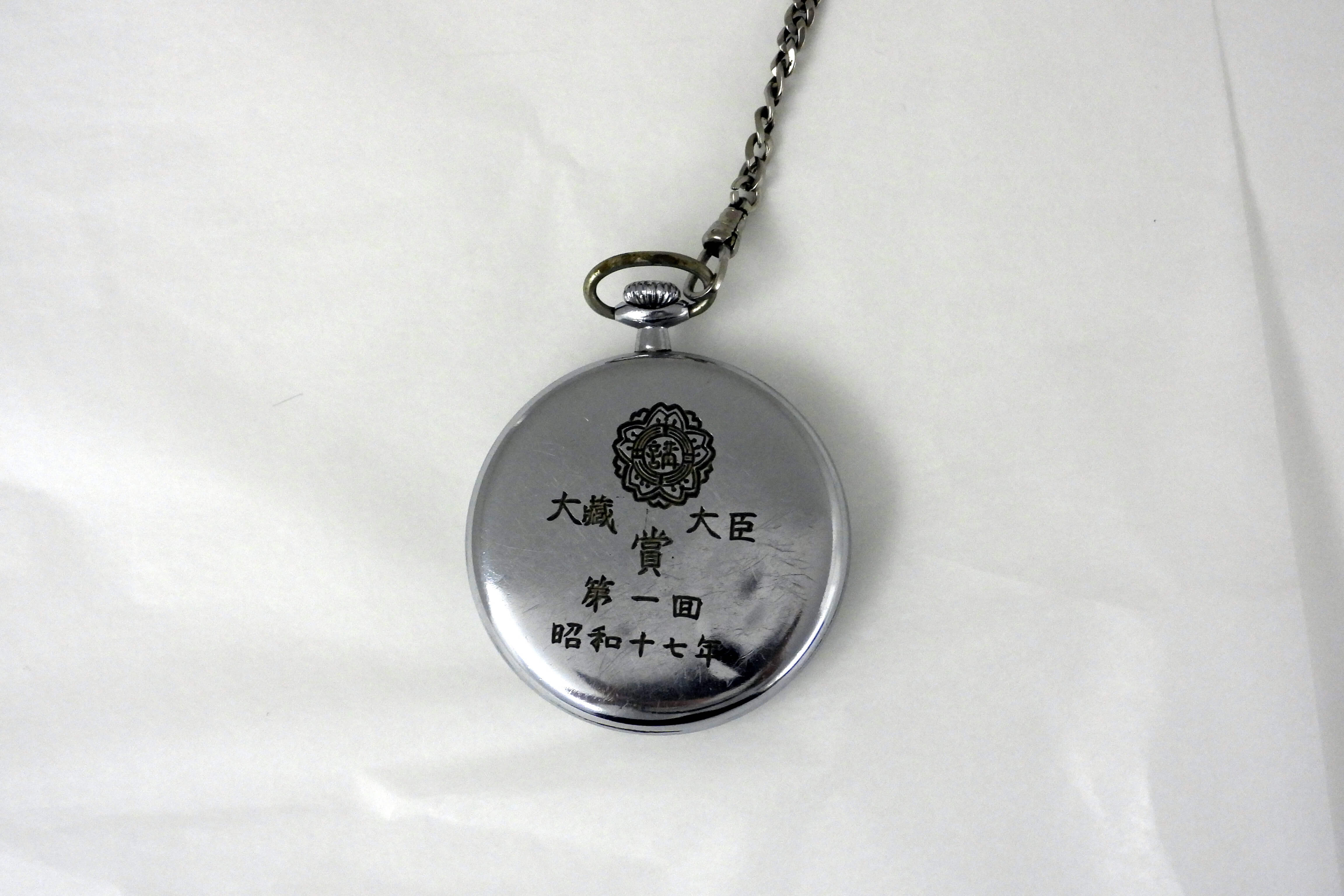 税務講習所第一期生が受賞した大臣賞の銀時計です。税務講習所は昭和16(1941)年5月に大蔵省内に設置されました。一年間の研修を経て、成績優秀な修了者にこのような銀時計が記念品として贈呈されました。