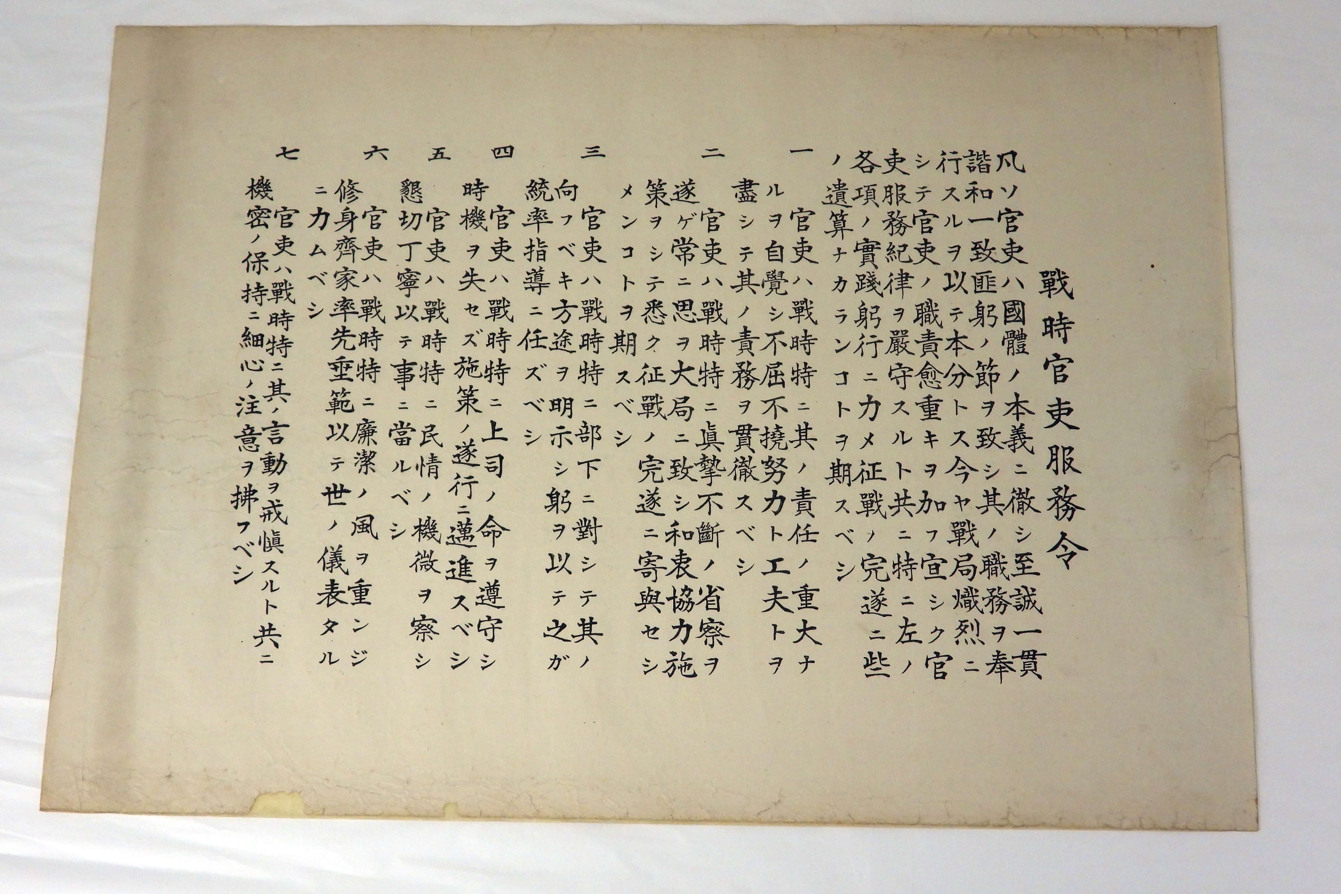 戦時官吏服務令は、昭和19(1944)年1月4日に発せられた勅令です。官吏の服務規律が箇条書きされ、より一層の職務への邁進や機密保持への注意などが命じられていました。