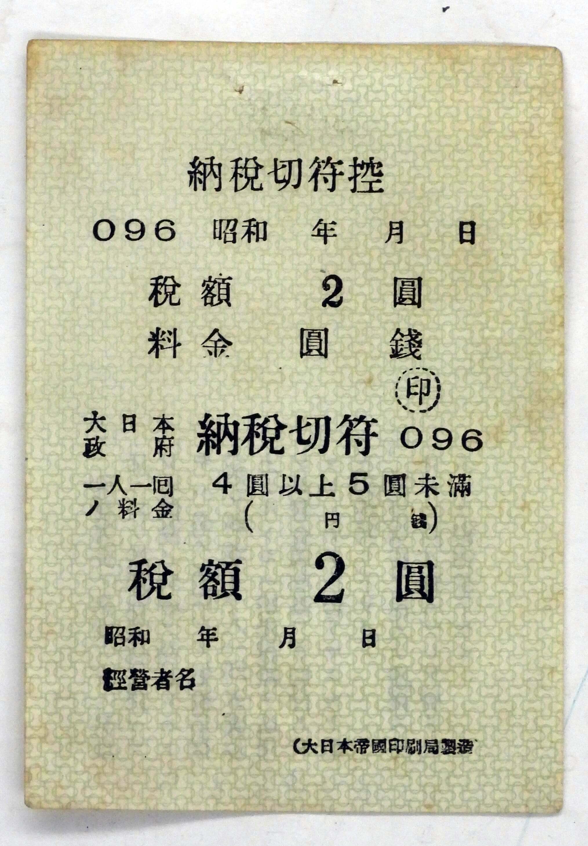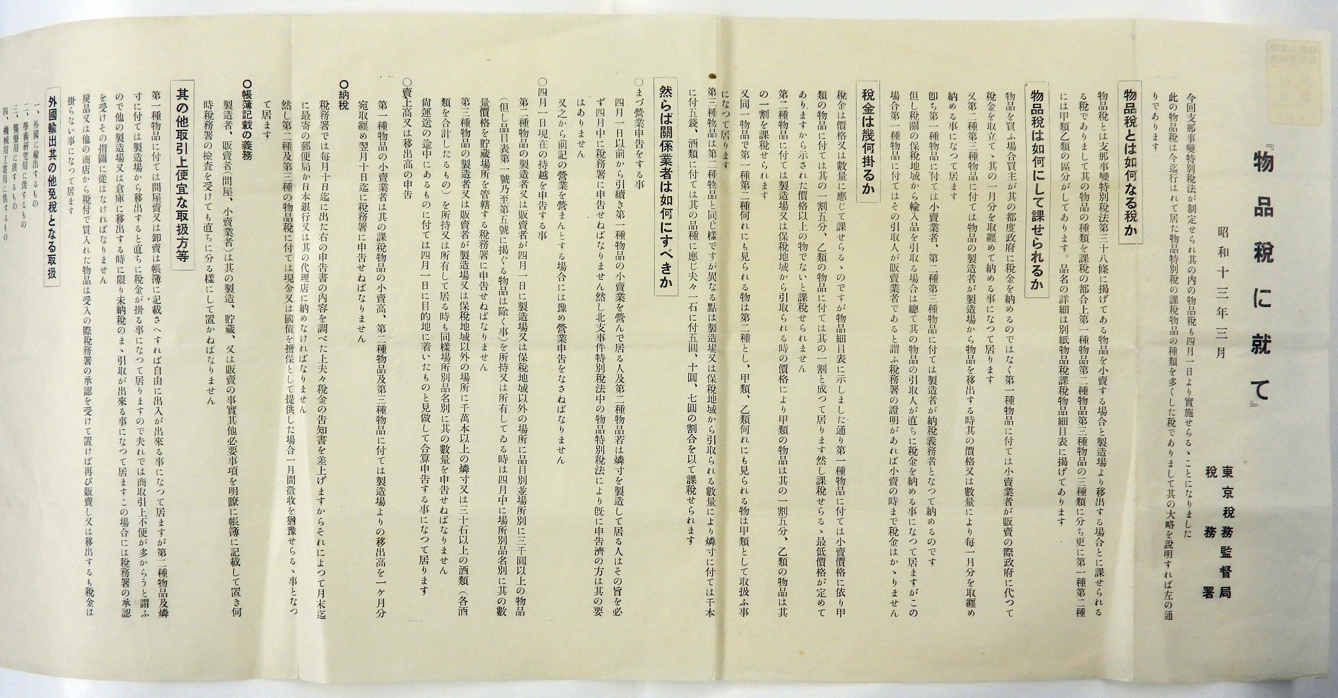 物品税は、宝石や自動車など奢侈的であるとされたものに課税された税金でした。物品税は、昭和12(1937)年に北支事件特別税の一税目として創設されました(当初は「物品特別税」という名称)。北支事件特別税は、同年に始まった日中戦争の戦費調達を目的として創設されました。翌昭和13(1938) の支那事変特別税法で課税範囲が拡大され、昭和15(1940)年に物品税法が創設されて独立した税となりました。戦時中には割り箸などにも課税され、税率も高く設定されました。