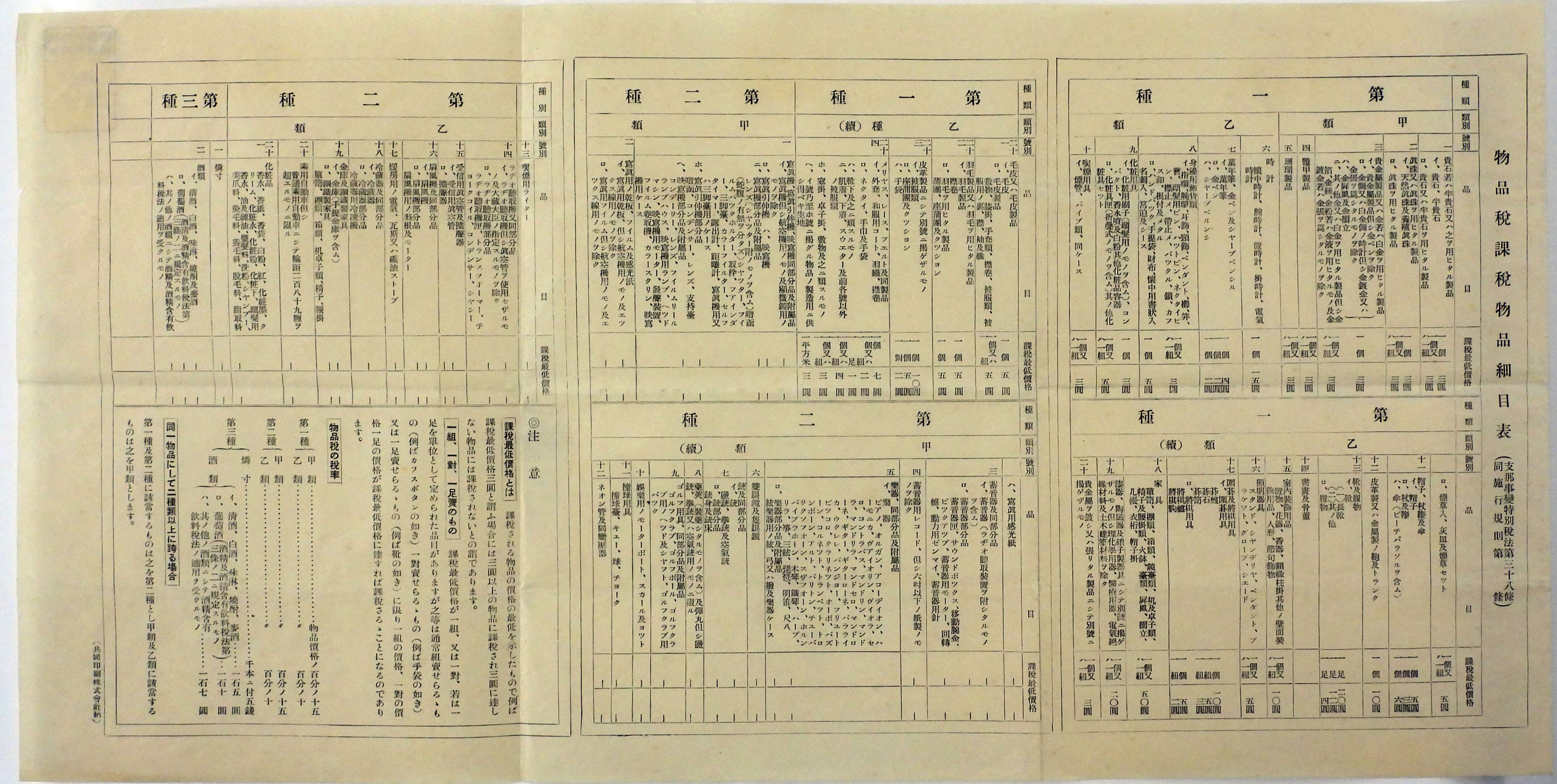 右の史料は、昭和13(1938)年の物品税課税物品細目表です。