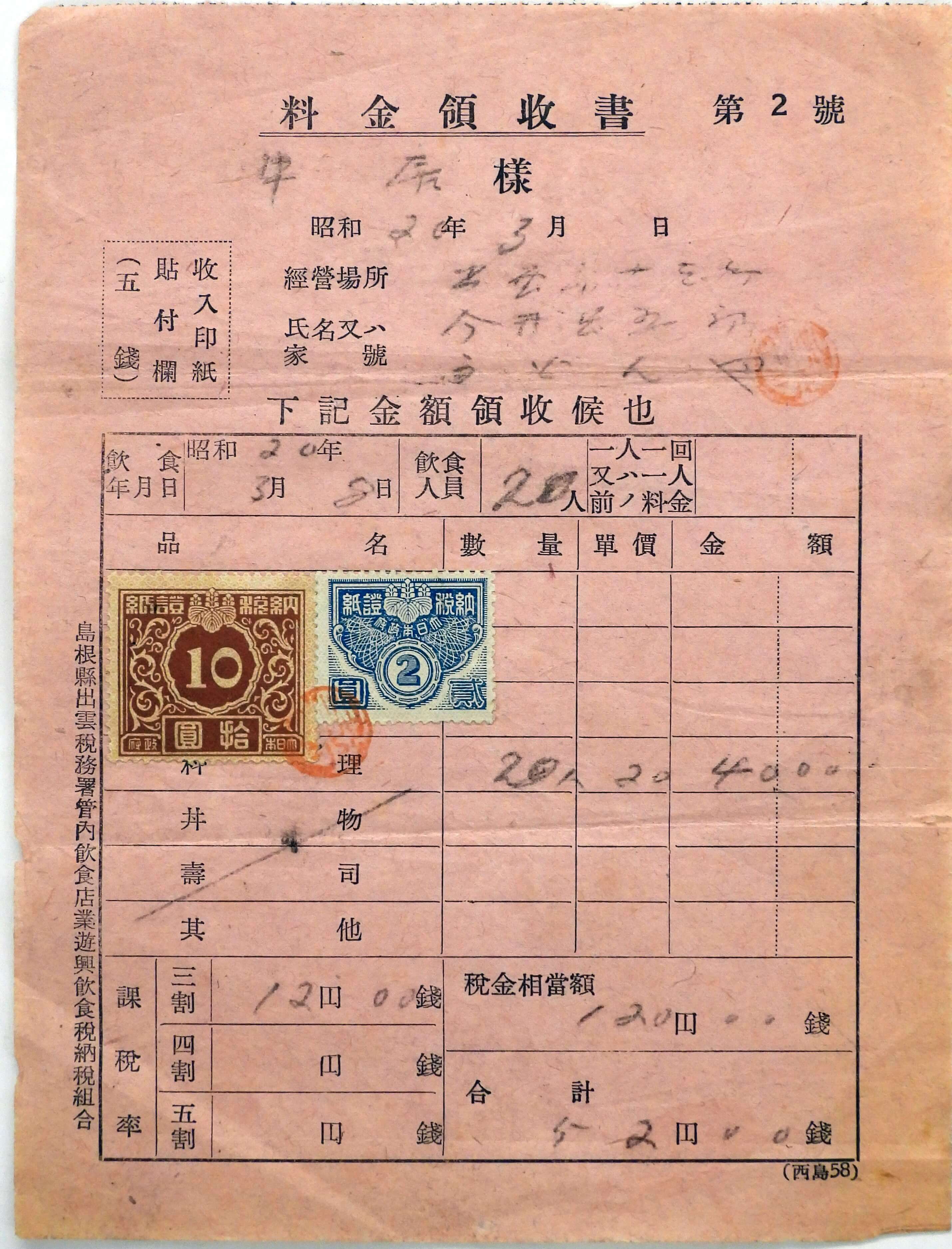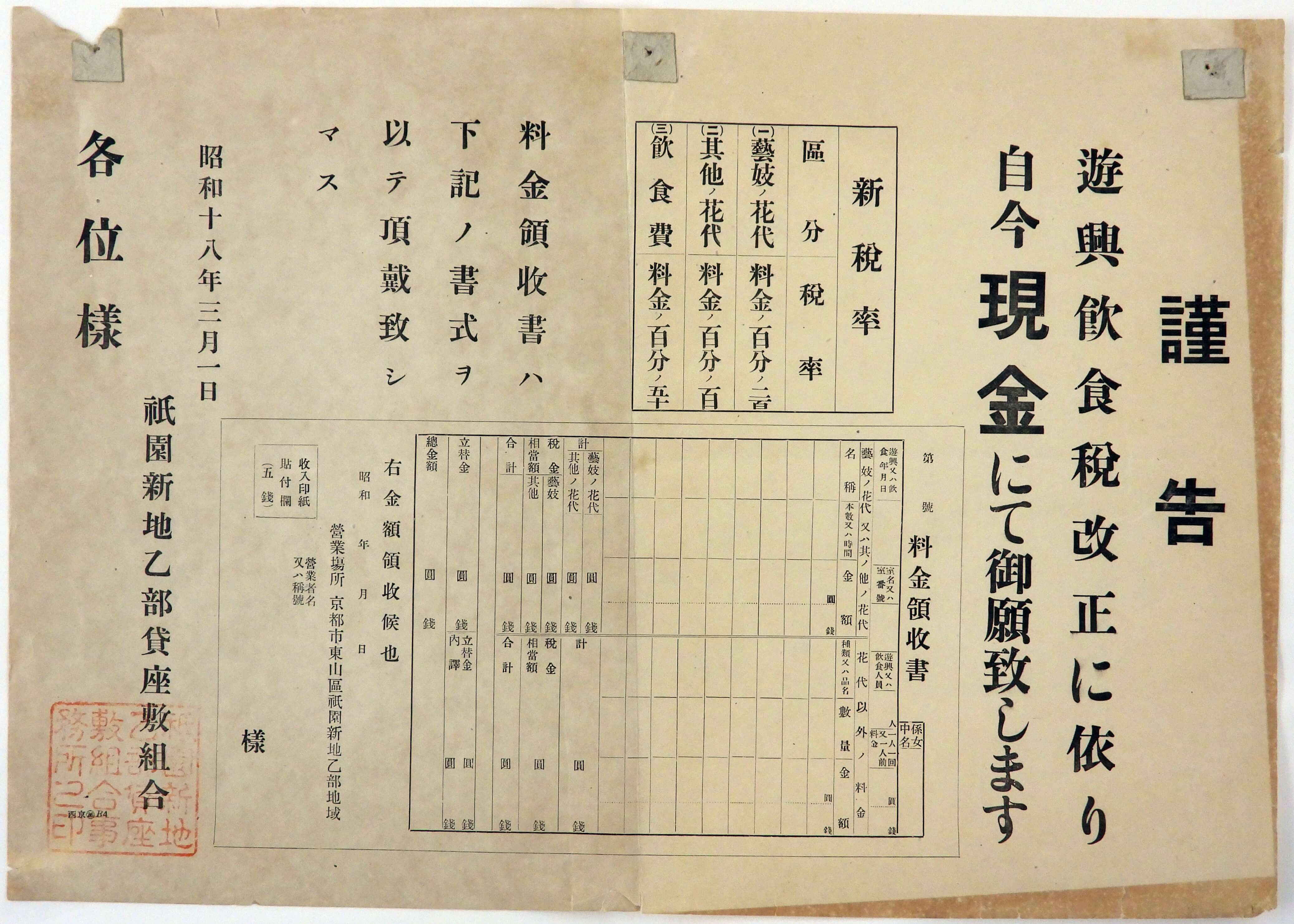 戦時中に発行された、遊興飲食税に関する史料(ポスター・納税切符・領収書)です。遊興飲食税は、昭和14(1939)年の支那事変特別税改正時に同税の一税目として創設され、昭和15(1940)年に遊興飲食税法が創設されて、独立した税となりました。