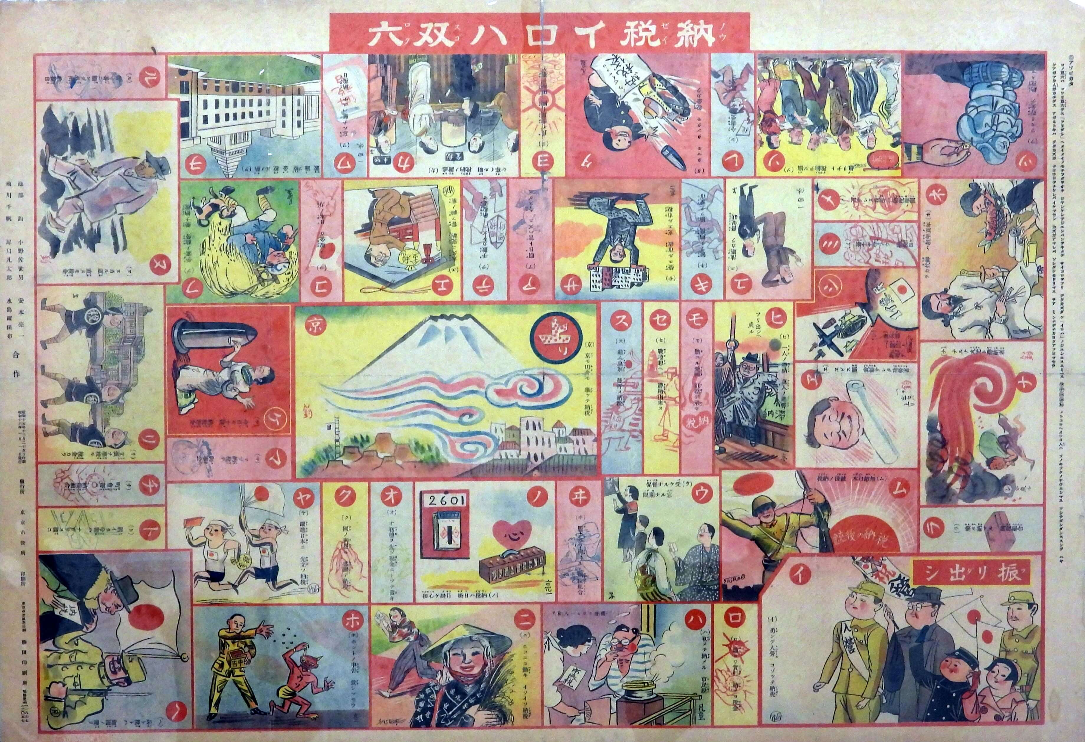 東京市役所が昭和16(1941)年1 月に発行した納税双六です。この双六は、市内の国民学校初等科1年生に配布され、非常に好評を得ました。