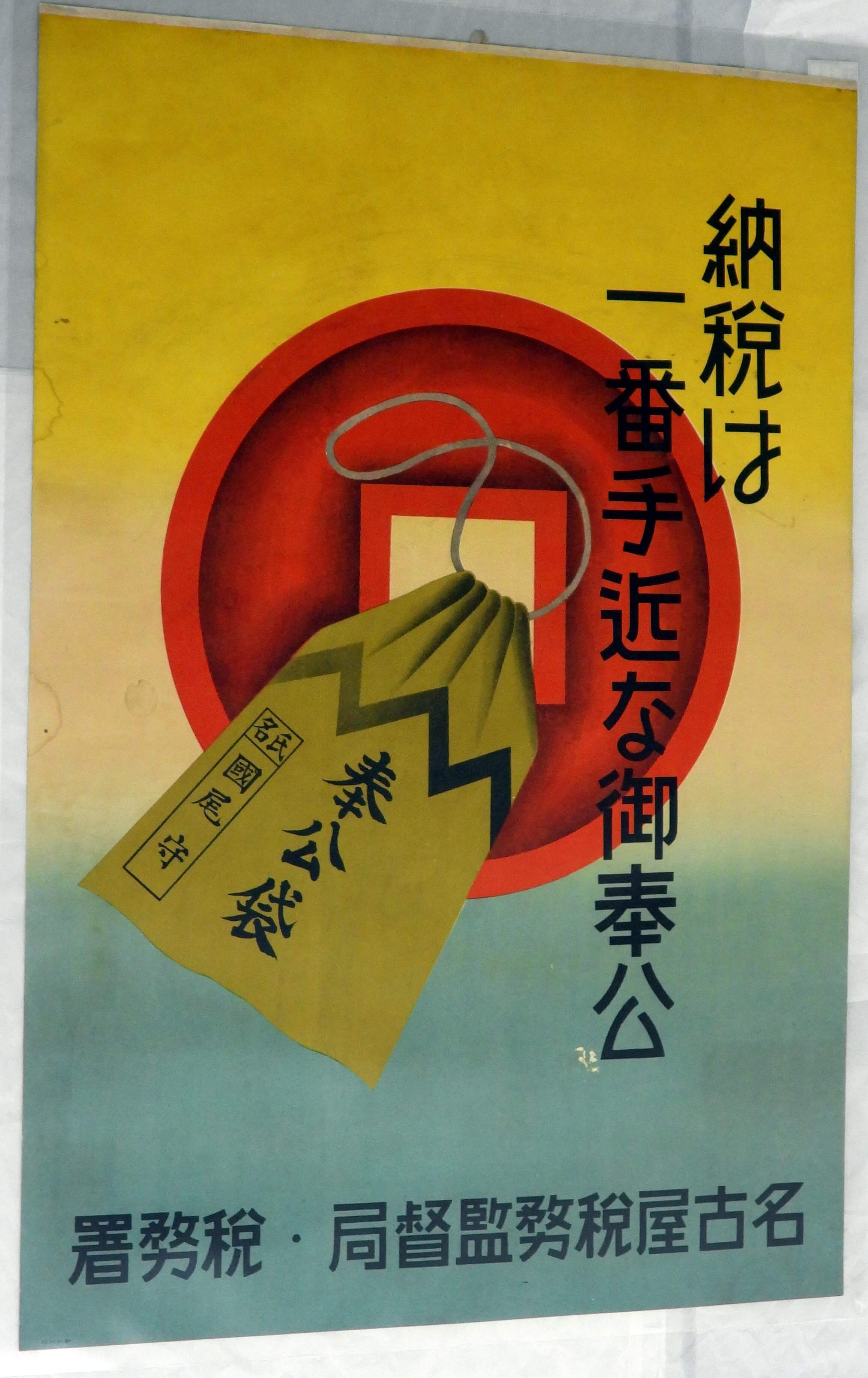 下の史料は、名古屋財務局と税務署が連名で発行したポスターで、「納税は一番手近な御奉公」という標語が目を引きます。