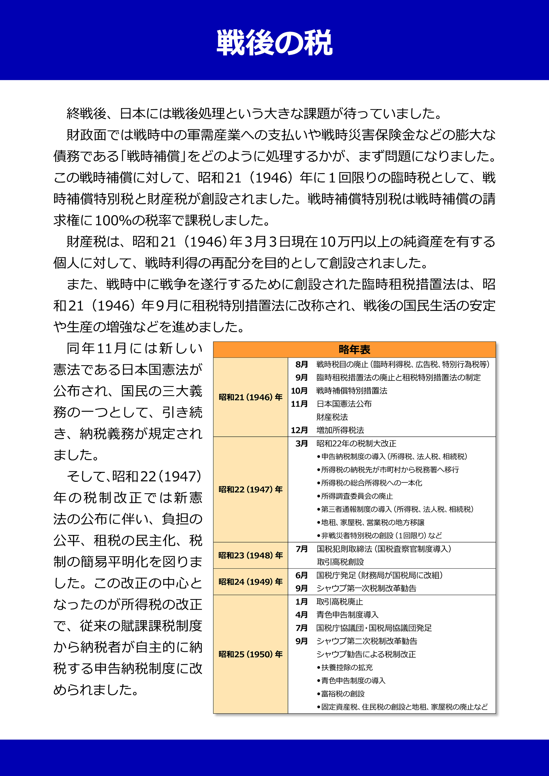 喫緊の問題として、戦時中の軍需産業への支払いや戦時災害保険金などの膨大な債務である「戦時補償」をどのように処理するかが挙げられました。この戦時補償に対して、昭和21(1946)年に1回限りの臨時税として戦時補償特別税と財産税が創設されました。同年11月には、新しい憲法である日本国憲法が公布され、国民の三大義務の一つとして引き続き、納税義務が規定されました。