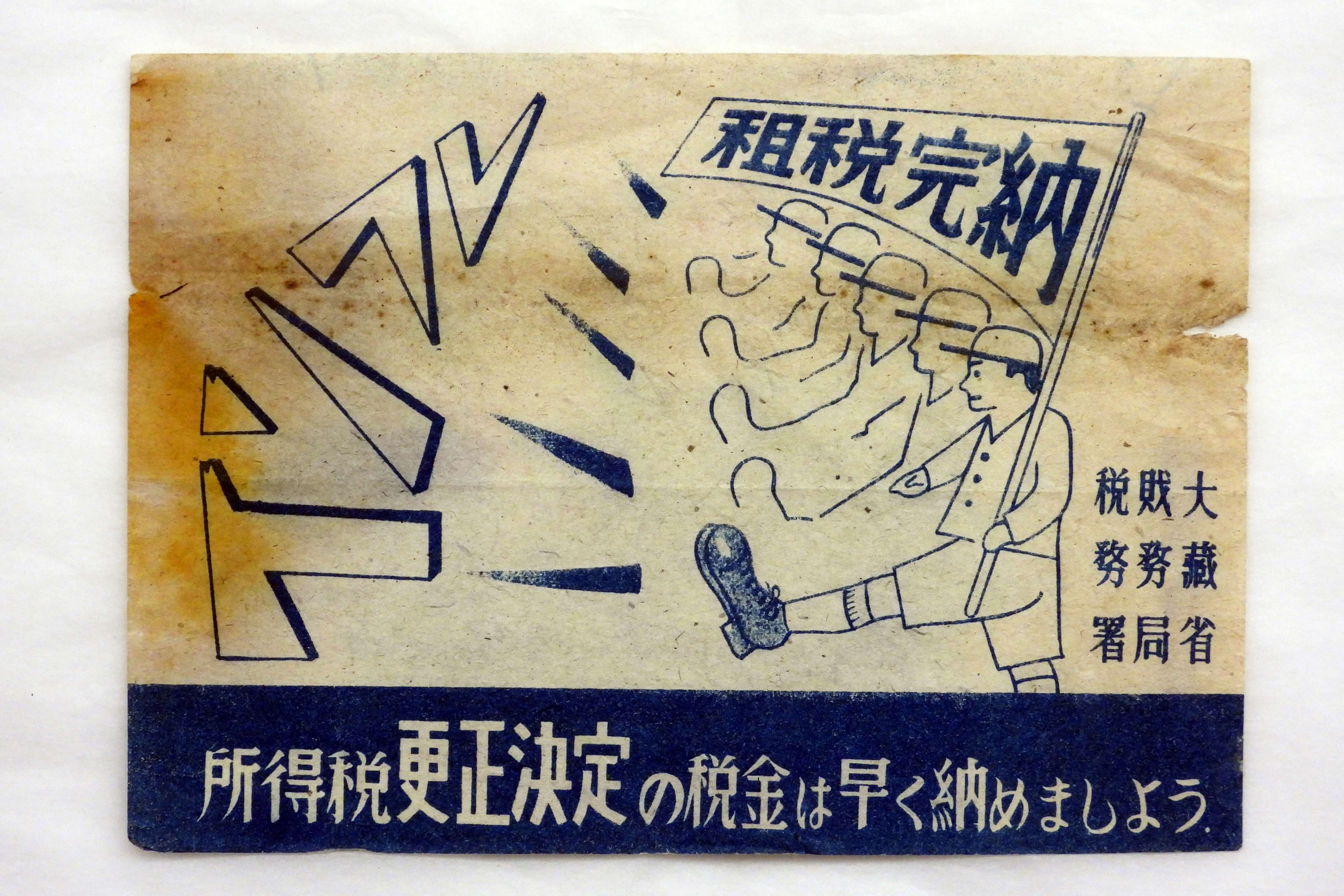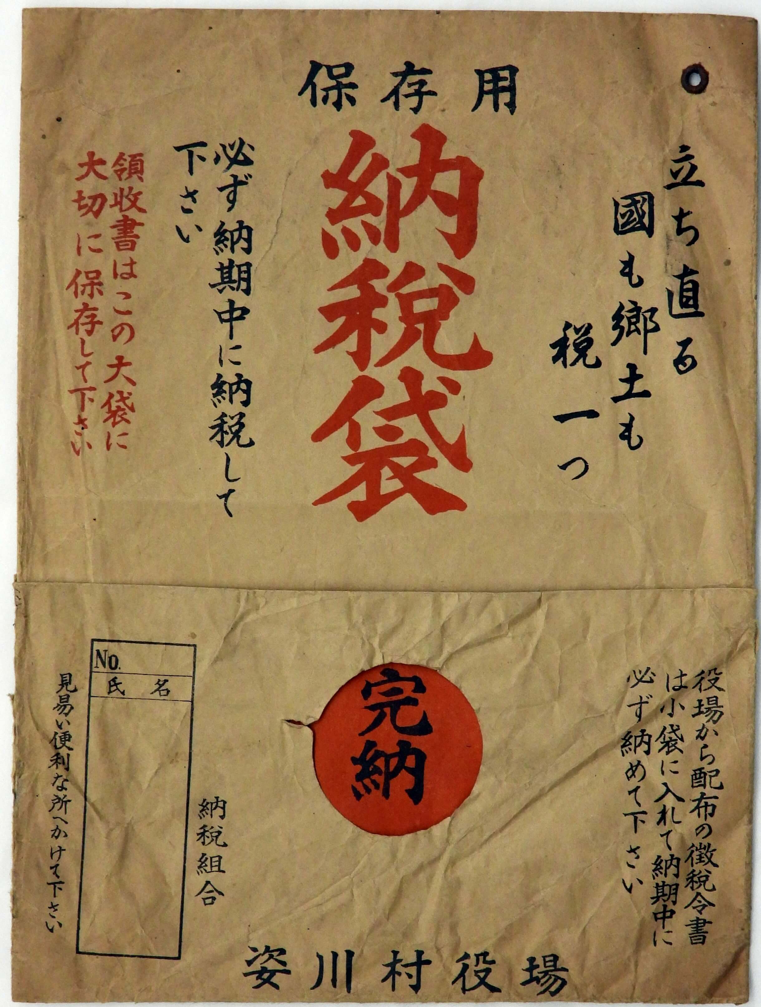 戦後に製作された納税袋です。先に紹介した納税令書入れと用途は同じですが、こちらは紙でできています。「立ち直る国も郷土も税一つ」というスローガンが印象的です。