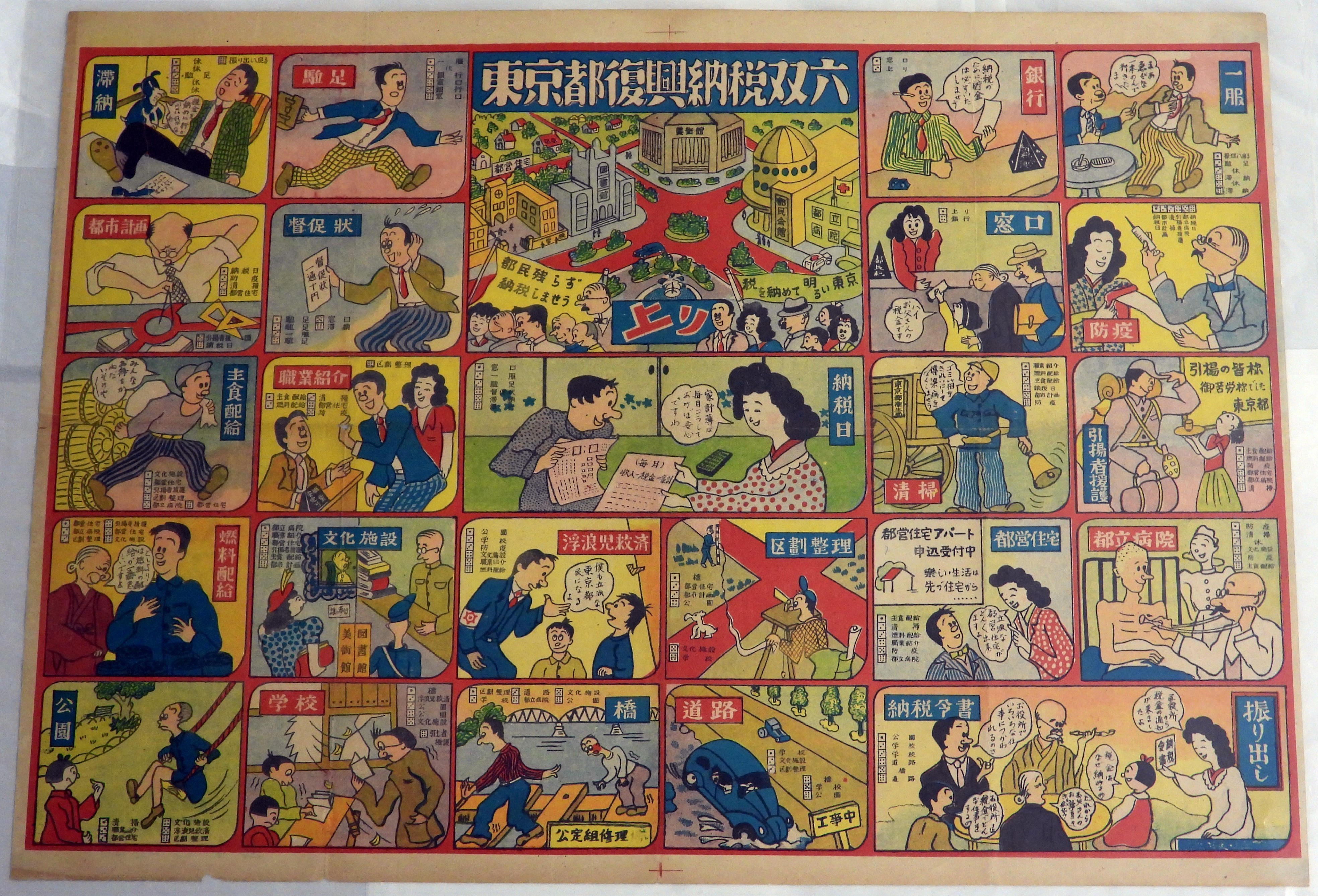 東京都が昭和24(1949)年に作成した双六です。道路整備や都市計画といった、現在も行われている業務の他に、主食配給や引揚者擁護といった、戦後ならではの復興業務を見ることができます。