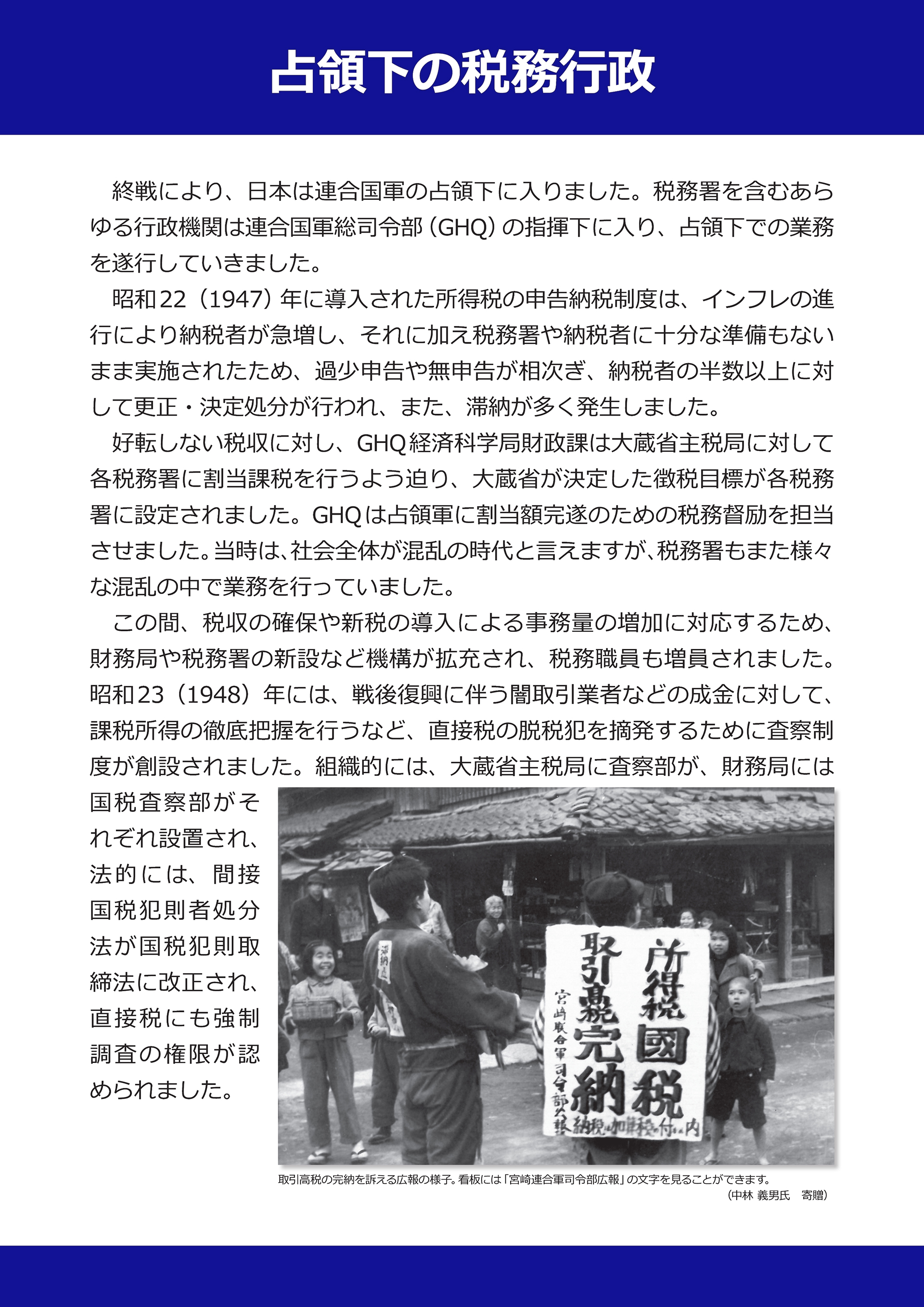 当時の税務職員たちの背後にある門標は、日本語と英語が併記されたものになっております。戦後の占領下の税務署ではこのような日本語・英語併記の門標が掲げられ、連合国軍の兵士に分かるようになっていました。