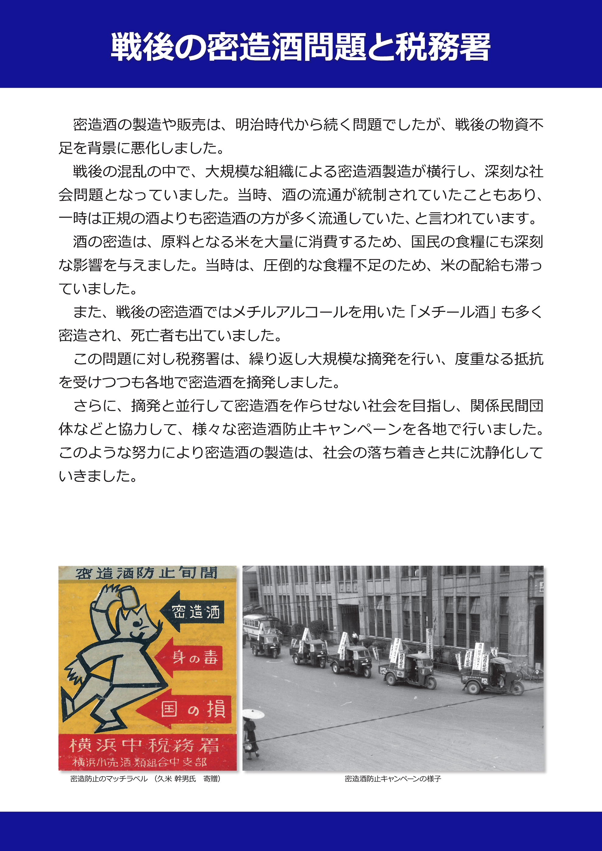 この時期の税務署を悩ませた問題として特筆されるのが、密造酒の氾濫でした。全国各地で大規模な密造酒摘発と、密造防止のキャンペーンが行われ、長い間税務署の重要な業務となりました。