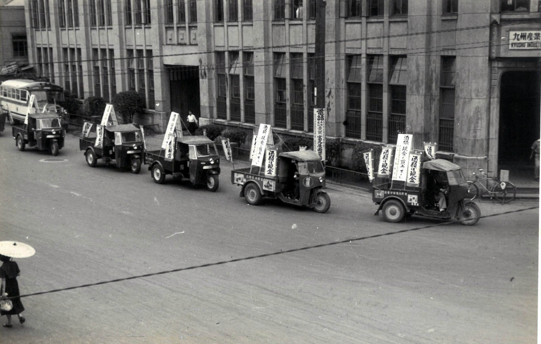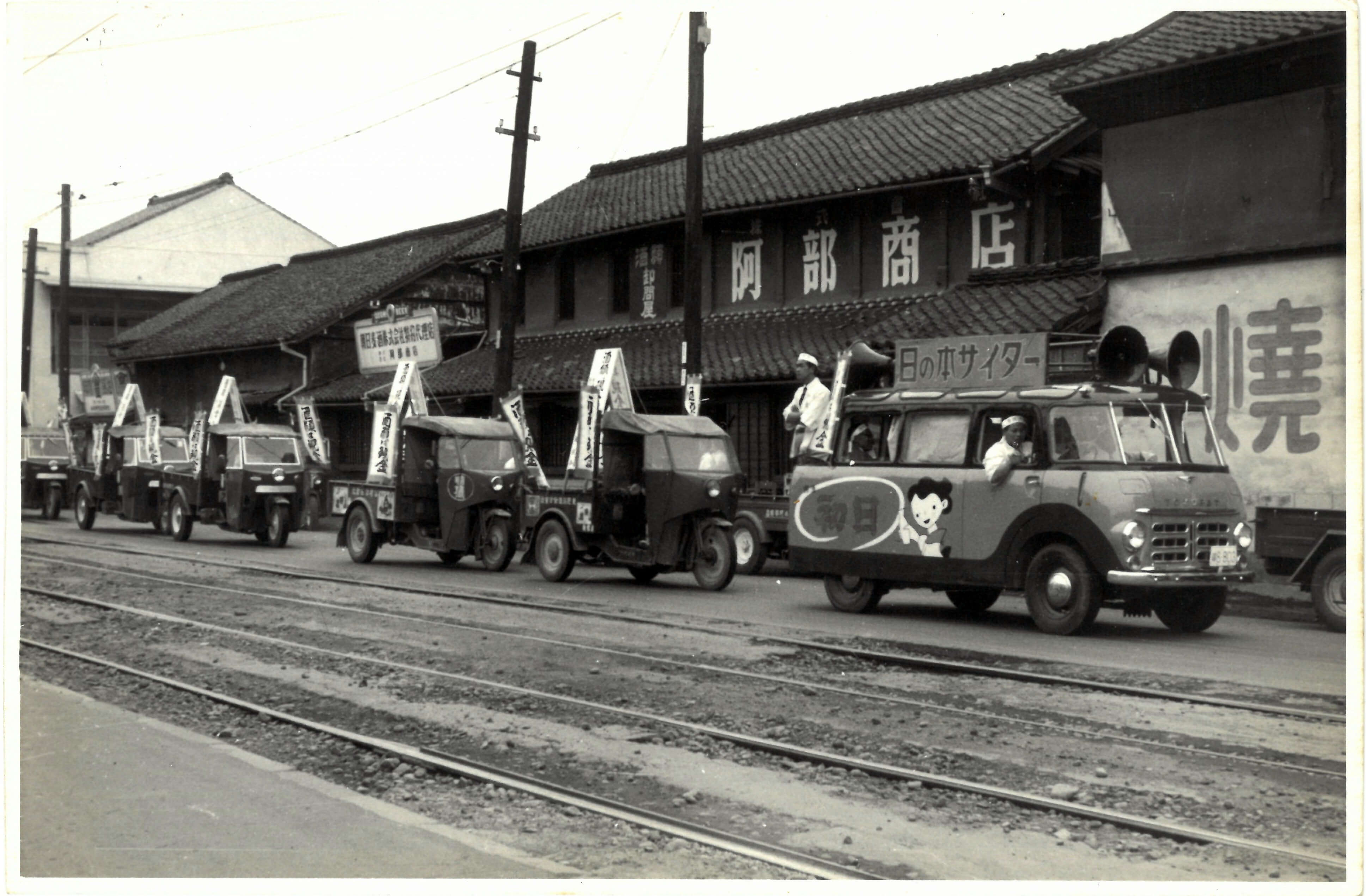 写真のように、密造酒防止の横断幕を付けたトラックやバスなどを走らせての広報活動は、この時期に各地の税務署で見られた光景です。税務職員や関係団体の手によって飾り付けられた自動車には、それぞれの工夫が見て取れます。