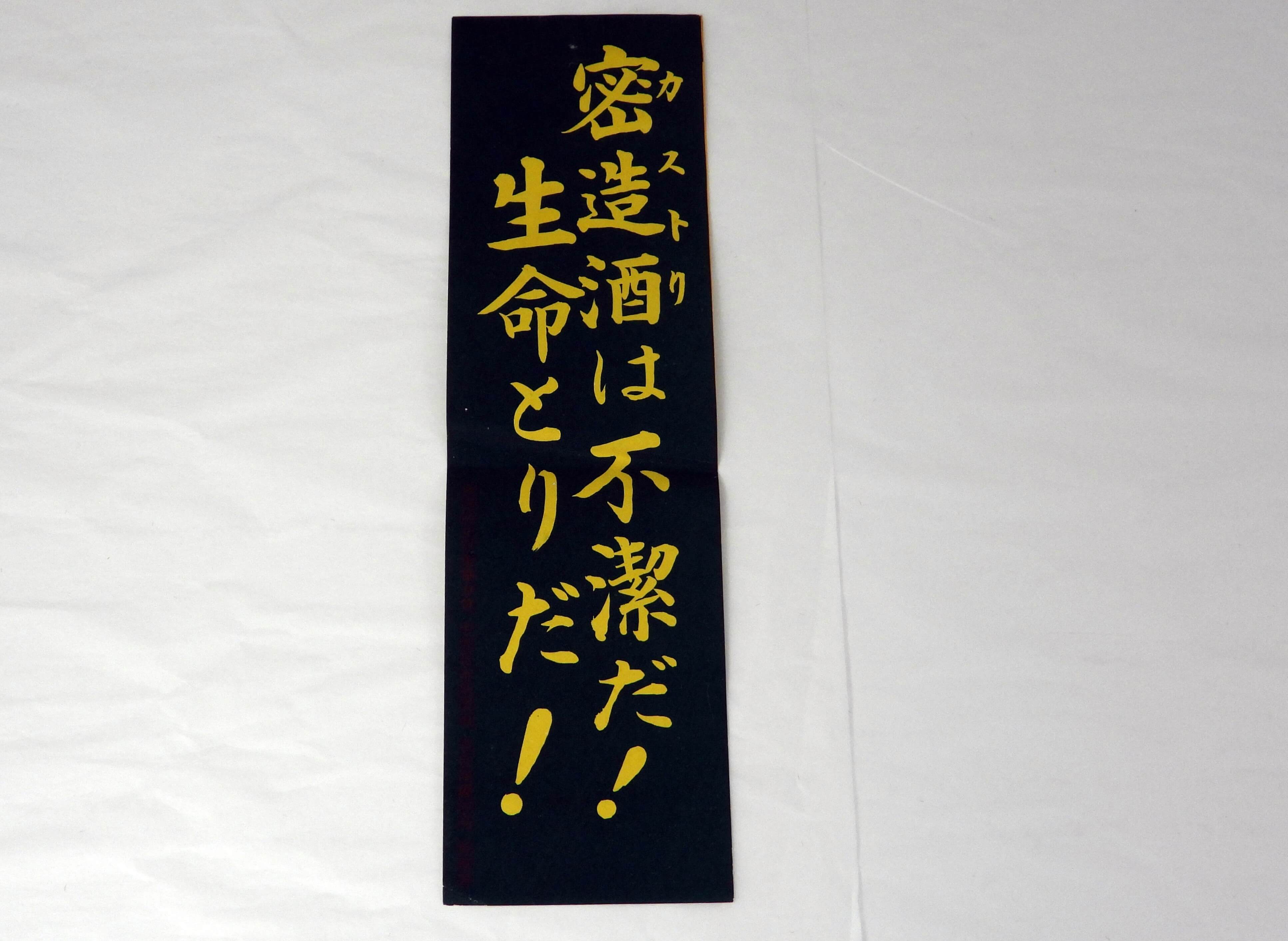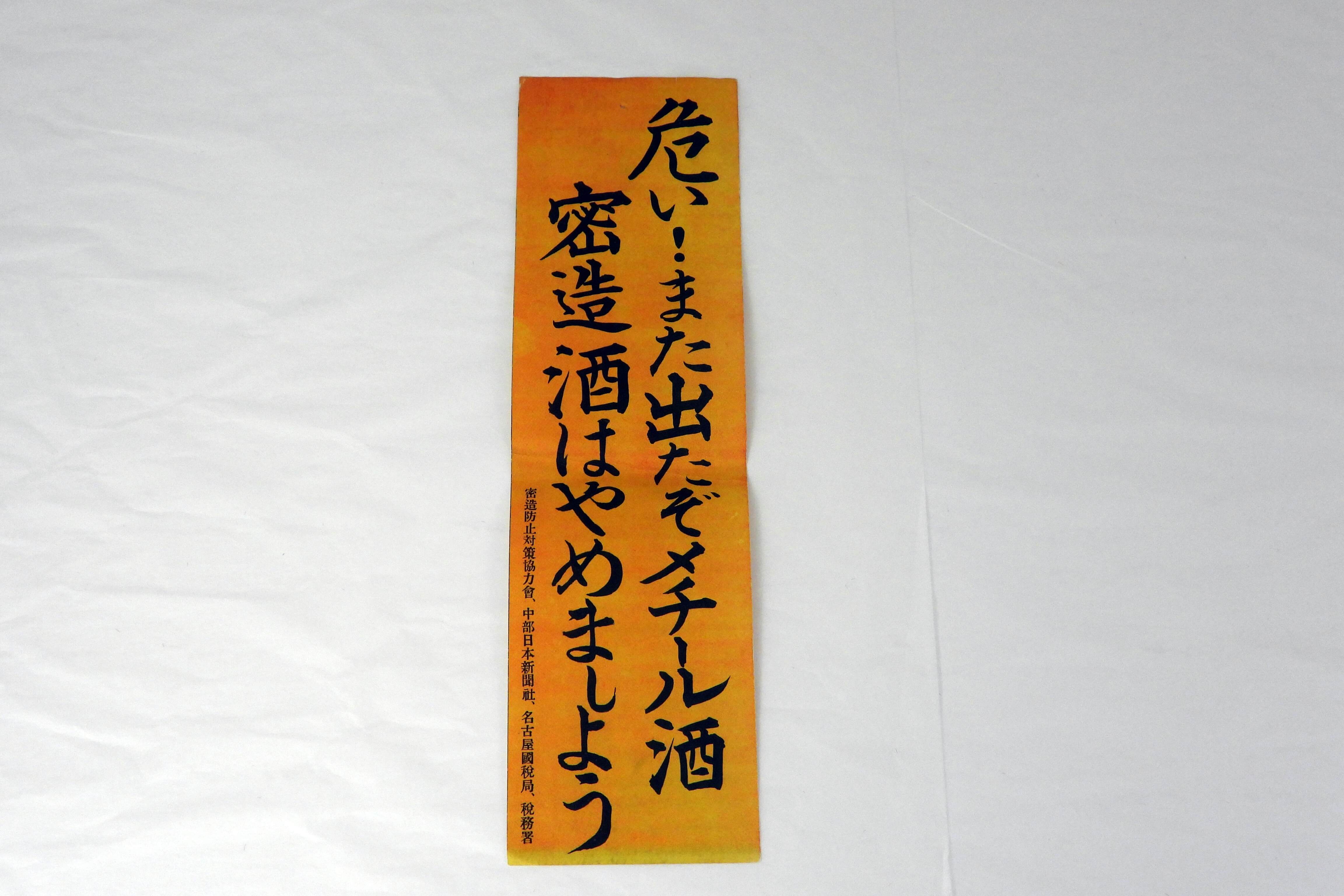 密造酒の取締りと並行して、税務署や酒造組合などが中心となって、密造酒防止の活動も盛んに行われました。戦後、人体に有害なメチルアルコールを用いたメチール酒が、闇市などで売られ死亡者も出ていました。