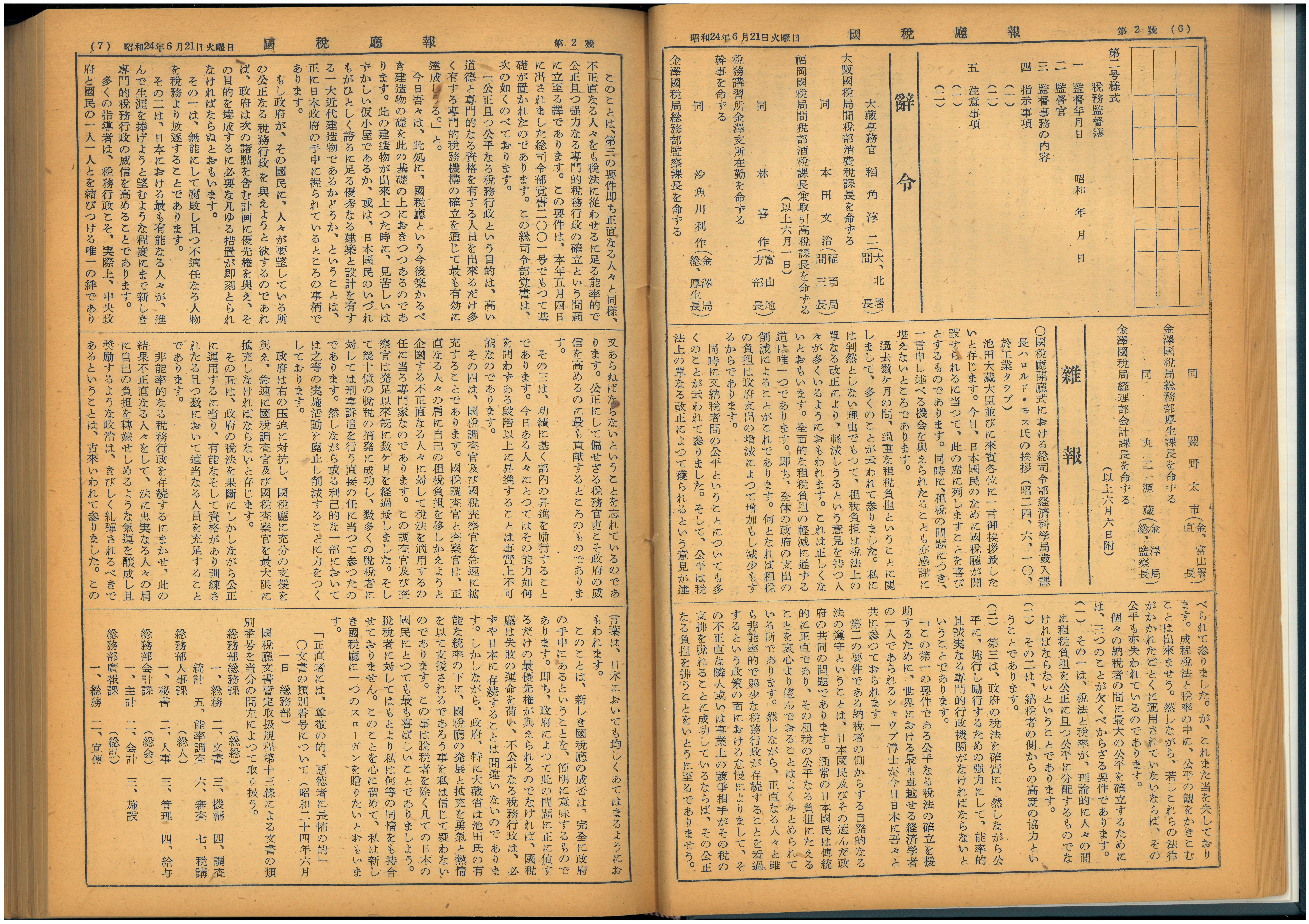 昭和24(1949)年6月10日に行われた国税庁の開庁式でGHQの歳入課長であったハロルド・モス氏のあいさつを紹介した国税庁の部内報です。