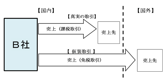 B社は、機械製品等の輸出を行う会社ですが、国内の売上先に対する売上(課税取引)を、国外に輸出した物品等の売上(免税取引)に仮装する方法により、不正に多額の消費税を免れるとともに、消費税の還付を受けていました。