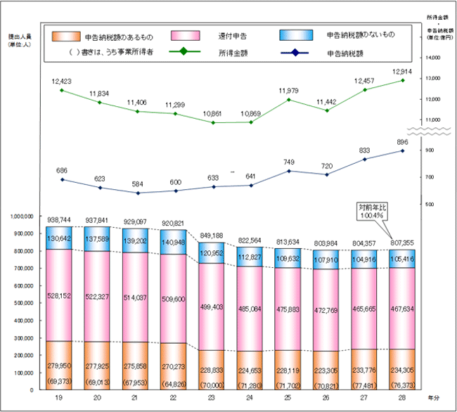 平成28年分所得税等の確定申告書の提出人員は807,355人で、平成27年分(804,357人)から2,998人(+0.4%)増加と、平成26年分からほぼ横ばいで推移しています。