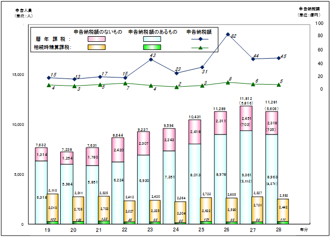 =申告件数は52,598件で、平成24年分からほぼ横ばいで推移、納税申告額は4年連続で増加=