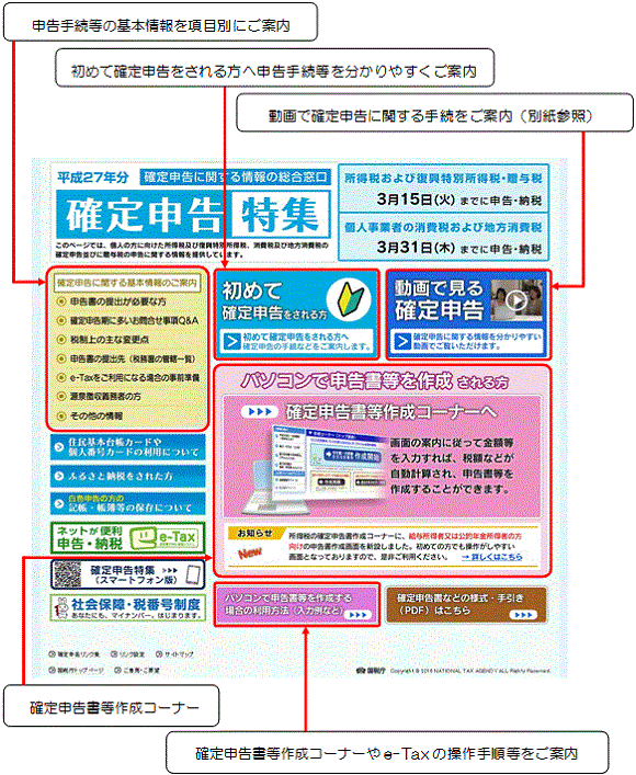 ○ インターネットをご利用の方は、確定申告特集ページを是非ご覧ください。このページでは、所得税及び復興特別所得税、消費税及び地方消費税並びに贈与税の申告に関する情報を以下のとおり提供しています。