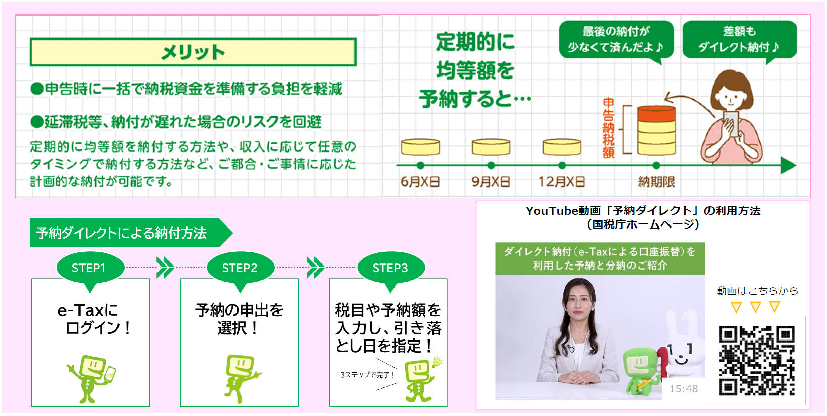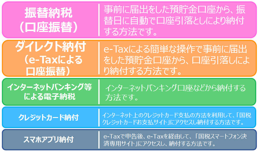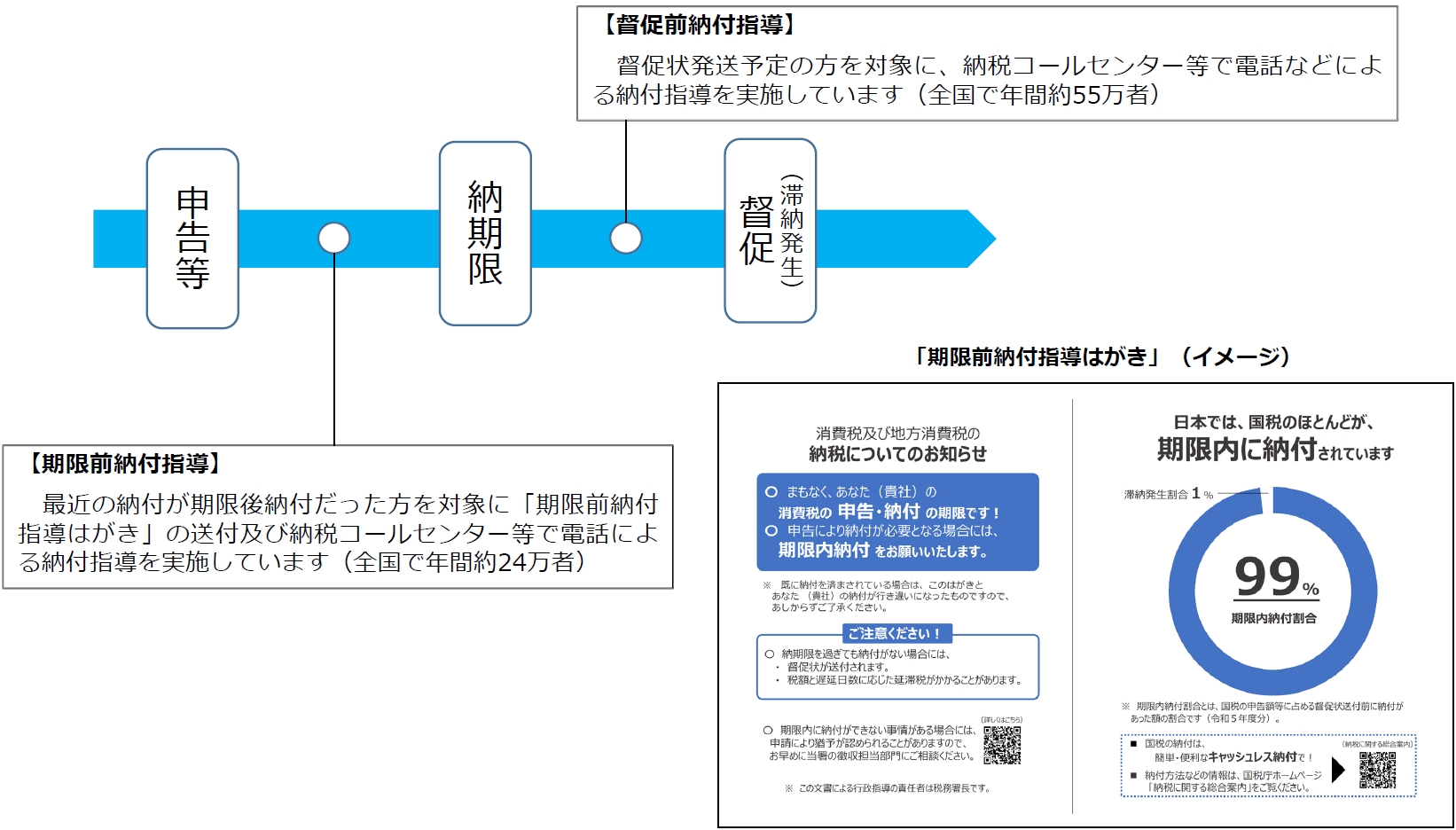 国税庁では、適正かつ公平な徴収を実現するため、納税者の方に期限内に納付していただけるよう、以下のような滞納の未然防止策に取り組んでいます。