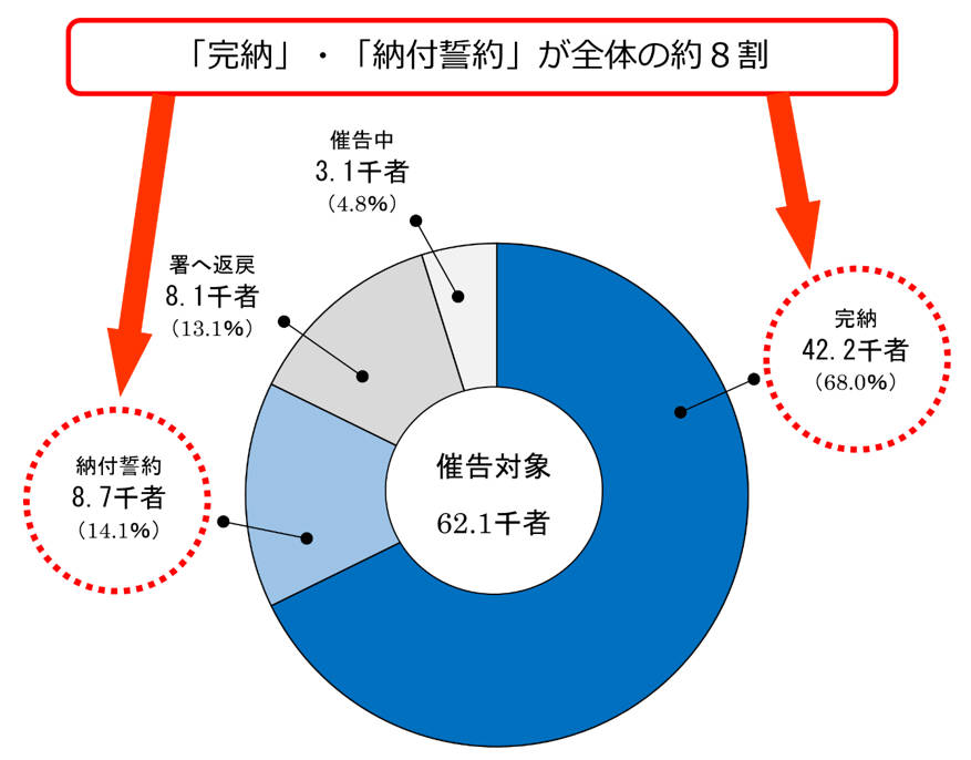 例えば、令和5年度の徴収決定済額(申告等により課税されたものの額)については、99.0%が滞納になることなく納付されており、滞納となったものについても、そのほとんどが比較的短期間で徴収され、令和6年度末時点では99.8%が徴収されています。