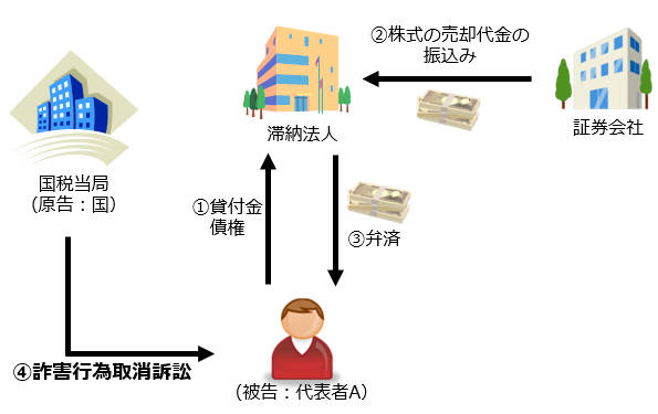 ④国は、当該弁済は、滞納法人が支払不能の時に、Aと滞納法人が通謀して他の債権者を害する意図をもってされたものであり、債権者を害する行為に該当するとして、詐害行為取消訴訟を提起した。その後、国の主張を認容する判決がなされた結果、Aから弁済金額相当額の履行を受けた。
