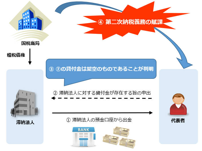 ③しかし、調査を進めた結果、当該貸付金は架空のものであり、実際には、滞納法人の預金口座から出金された滞納法人の資金を代表者が不正に受領していたことが判明した。