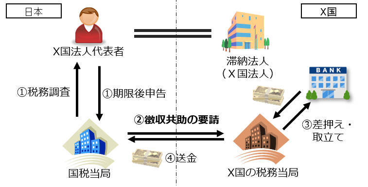 ③その結果、X国の税務当局が滞納法人名義のX国銀行口座を差し押さえ、その預金額について送金を受け、滞納国税を徴収することができた。