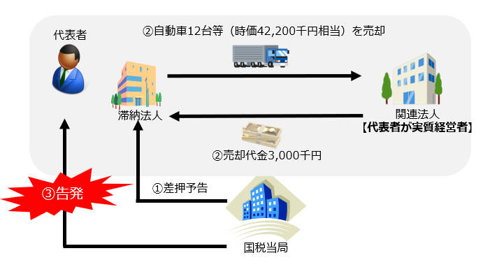 ③国税当局は、上記Aの行為は滞納法人に対する滞納処分の執行を免れる目的でされた、国に不利益な財産の処分に該当すると判断し、代表者を国税徴収法違反(滞納処分免脱罪)で告発した。
