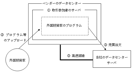 本市場に参加しようとする投資家は、プロキシミティサービスを利用し先物取引を行うために、ベンダーのデータセンター内に設置された取引参加者のサーバにコンピュータ・プログラム等をアップロードして、設定・保存することとなりますが、本市場には、外国法人や非居住者といった外国投資家も参加することが可能であるため、今後、これらの外国投資家がプロキシミティサービスを利用することが想定されます。