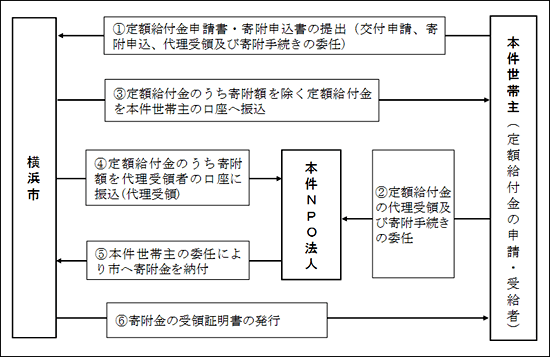 総務省が定めた「定額給付金給付事業費補助金交付要綱」によれば、定額給付金は、申請者に対して給付することが要件とされているため、定額給付金と寄附金を相殺することができません。そこで、横浜市では、定額給付金を寄附しようとする給付金の申請・受給者である世帯主(以下「本件世帯主」といいます。)の手続負担を軽減するために、本件世帯主に代わって特定非営利活動法人市民セクターよこはま(以下「本件NPO法人」といいます。)に代理受領及び横浜市への寄附手続を委任する方法を採用することとしました。