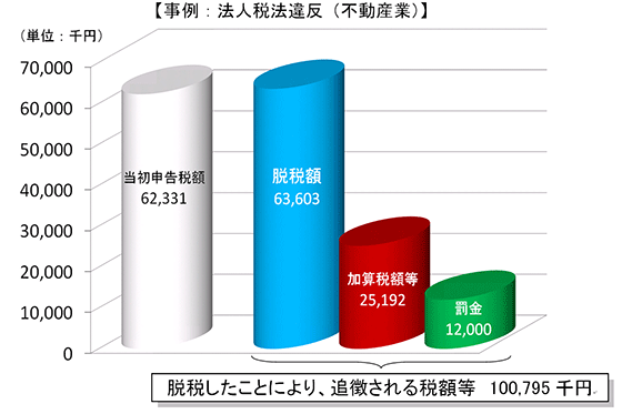平成26年度中に判決が確定した不動産業を営む法人が63,603千円を脱税したケースでは、脱税額、加算税額及び罰金など合計100,795千円を追徴しました。