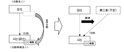 当社は、事業資金の確保等のために、〇〇事業を資本関係のないグループ外の法人へ売却することを計画しています。具体的には、A社を設立した後、分社型分割(以下「本件分割」といいます。)により〇〇事業をA社に移転し、その後、A社株式を第三者に譲渡する予定としています。